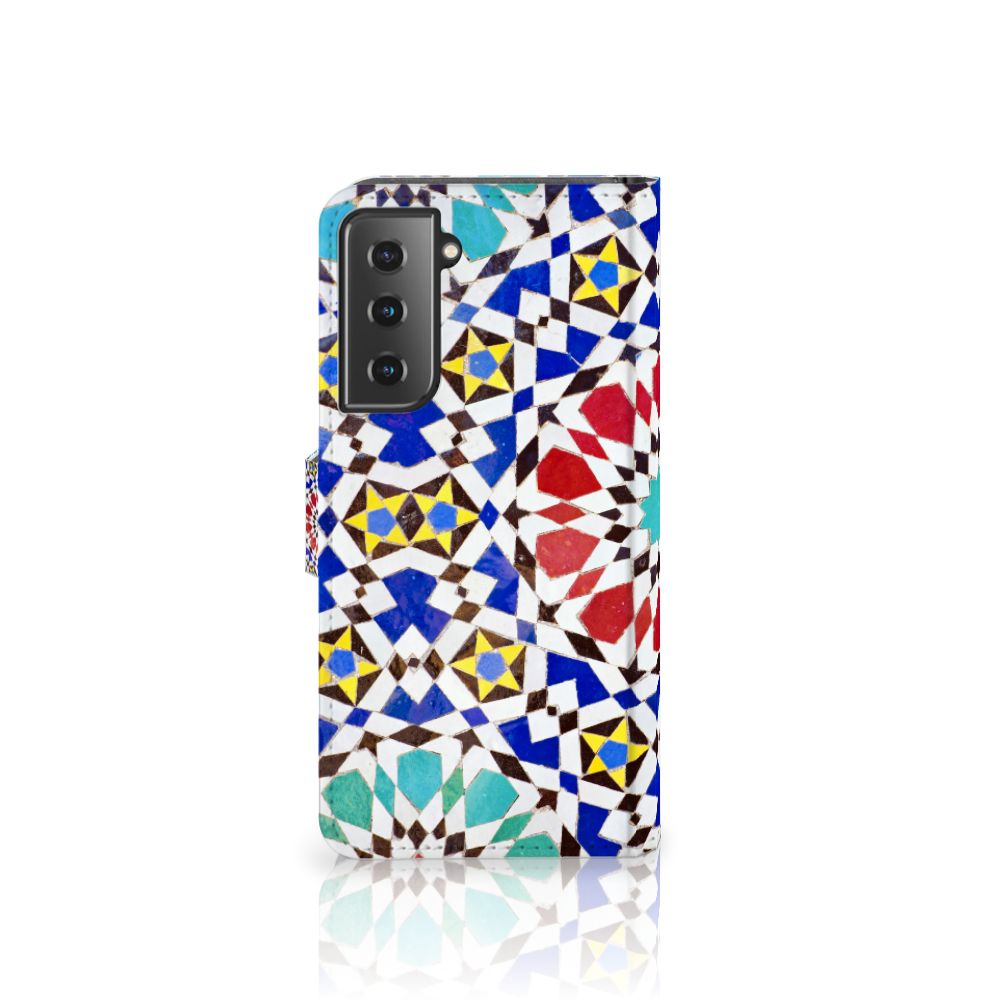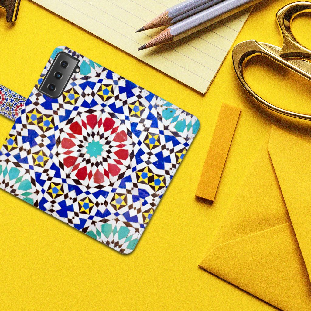 Aan design hoesjes met kunstvormen geen gebrek in onze uitgebreide collectie. Wat dacht je van dit design hoesje met Mozaïek . Dit is een kunstvorm waarbij een grote afbeelding wordt gemaakt uit een groot aantal kleine gekleurde steentjes (tesserae), die in een vloer of wand worden gemetseld. Deze gekleurde steentjes zie je terug op dit boekhoesje met design van mozaïek. Een boekhoesje is zo’n beetje de veiligste case die er bestaat. Een Samsung Galaxy S21 Bookcase met print zorgt voor een volledige bescherming van je smartphone en wordt aan alle zijden bedrukt met mozaïek. Een deel van de foto’s staat ook op het lipje aan de buitenzijde. Verder is de houder aan de binnenzijde van TPU. De Grieken en Romeinen beheersten de kunst al. Op diverse plaatsen in Europa zijn mozaïeken teruggevonden die tot op de dag van vandaag goed bewaard zijn gebleven. Met een hoesje met mozaïek blijft jouw telefoon in tact. Je pasjes en briefgeld kun je in de vakjes aan de binnenzijde stoppen