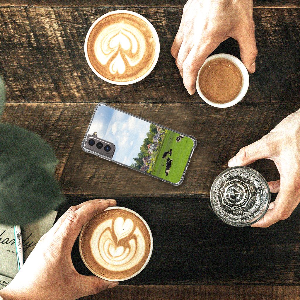 Ben je op zoek naar een uniek telefoonhoesje voor je Samsung Galaxy S21? Dan ben je bij B2C Telecom aan het juiste adres! Speciaal voor jou hebben we dit prachtige Koeien design in onze collectie hoesjes opgenomen. Het design wordt bedrukt op een Case Anti-shock en is gemaakt van flexibel rubber. Het hoesje is perfect voor de actieve smartphonegebruiker door de opstaande randen/hoeken. Denk aan mensen die veel sporten, reizen of wandelen en net iets meer zekerheid willen als het op hun geliefde telefoon aankomt. Het design wordt alleen aan de bovenkant van het hoesje bedrukt en de randen blijven transparant. Aan de zijkanten zijn uitsparingen gemaakt waardoor je met gemak alle knoppen en poorten kunt bedienen. Wij adviseren om dit hoesje in combinatie met een screenprotector te gebruiken voor een langere levensduur van je telefoon. Wil je dit hoesje nog iets extra's geven? Voeg dan gratis je naam of een quote toe! Is dit design hoesje toch niet helemaal wat je zocht? Ontwerp dan zelf een hoesje in ons ontwerpprogramma.