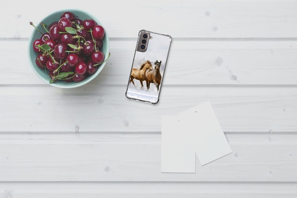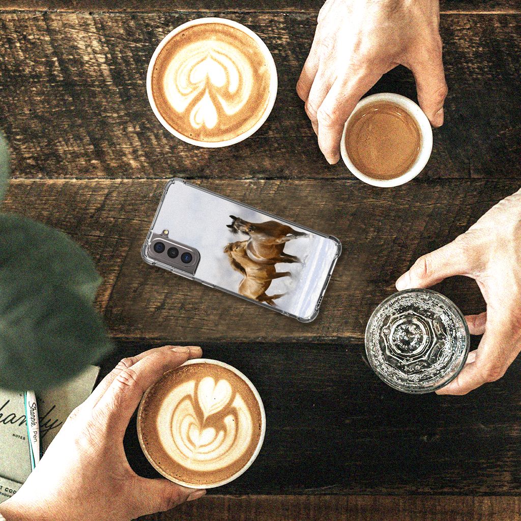 Ben je op zoek naar een uniek telefoonhoesje voor je Samsung Galaxy S21? Dan ben je bij B2C Telecom aan het juiste adres! Speciaal voor jou hebben we dit prachtige Paarden in onze collectie hoesjes opgenomen. Het design wordt bedrukt op een Case Anti-shock en is gemaakt van flexibel rubber. Het hoesje is perfect voor de actieve smartphonegebruiker door de opstaande randen/hoeken. Denk aan mensen die veel sporten, reizen of wandelen en net iets meer zekerheid willen als het op hun geliefde telefoon aankomt. Het design wordt alleen aan de bovenkant van het hoesje bedrukt en de randen blijven transparant. Aan de zijkanten zijn uitsparingen gemaakt waardoor je met gemak alle knoppen en poorten kunt bedienen. Wij adviseren om dit hoesje in combinatie met een screenprotector te gebruiken voor een langere levensduur van je telefoon. Wil je dit hoesje nog iets extra's geven? Voeg dan gratis je naam of een quote toe! Is dit design hoesje toch niet helemaal wat je zocht? Ontwerp dan zelf een hoesje in ons ontwerpprogramma.