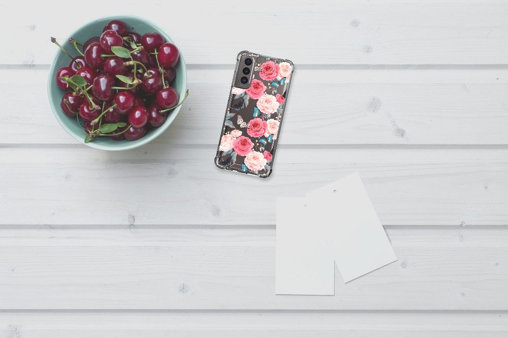 Ben je op zoek naar een uniek telefoonhoesje voor je Samsung Galaxy S21? Dan ben je bij B2C Telecom aan het juiste adres! Speciaal voor jou hebben we dit prachtige Butterfly Roses design in onze collectie hoesjes opgenomen. Het design wordt bedrukt op een Case en is gemaakt van flexibel rubber. Het hoesje is perfect voor de actieve smartphonegebruiker door de opstaande randen/hoeken. Denk aan mensen die veel sporten, reizen of wandelen en net iets meer zekerheid willen als het op hun geliefde telefoon aankomt. Het design wordt alleen aan de bovenkant van het hoesje bedrukt en de randen blijven transparant. Aan de zijkanten zijn uitsparingen gemaakt waardoor je met gemak alle knoppen en poorten kunt bedienen. Wij adviseren om dit hoesje in combinatie met een screenprotector te gebruiken voor een langere levensduur van je telefoon. Wil je dit hoesje nog iets extra's geven? Voeg dan gratis je naam of een quote toe! Is dit design hoesje toch niet helemaal wat je zocht? Ontwerp dan zelf een hoesje in ons ontwerpprogramma.