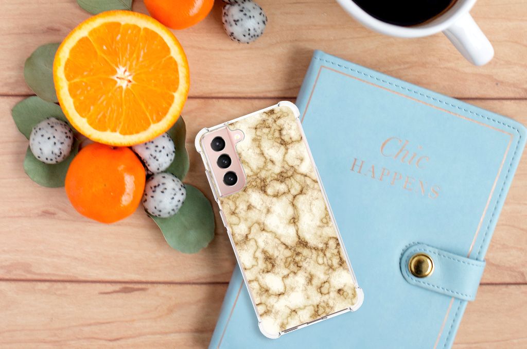 Ben je op zoek naar een uniek telefoonhoesje voor je Samsung Galaxy S21 FE? Dan ben je bij B2C Telecom aan het juiste adres! Speciaal voor jou hebben we dit prachtige Marmer Goud design in onze collectie hoesjes opgenomen. Het design wordt bedrukt op een Anti-Shock Hoesje en is gemaakt van flexibel rubber. Het hoesje is perfect voor de actieve smartphonegebruiker door de opstaande randen/hoeken. Denk aan mensen die veel sporten, reizen of wandelen en net iets meer zekerheid willen als het op hun geliefde telefoon aankomt. Het design wordt alleen aan de bovenkant van het hoesje bedrukt en de randen blijven transparant. Aan de zijkanten zijn uitsparingen gemaakt waardoor je met gemak alle knoppen en poorten kunt bedienen. Wij adviseren om dit hoesje in combinatie met een screenprotector te gebruiken voor een langere levensduur van je telefoon. Wil je dit hoesje nog iets extra's geven? Voeg dan gratis je naam of een quote toe! Is dit design hoesje toch niet helemaal wat je zocht? Ontwerp dan zelf een hoesje in ons ontwerpprogramma.