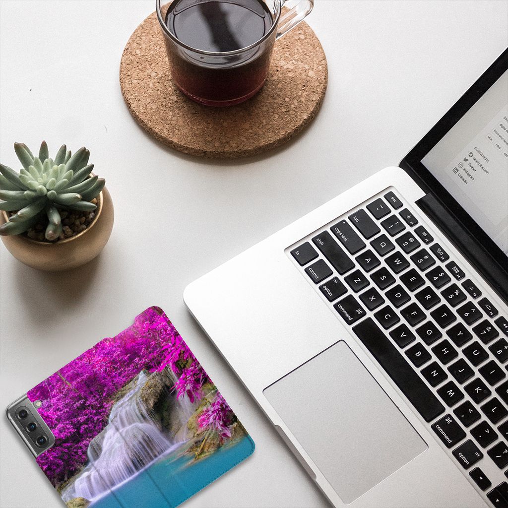 Van een waterval kun je een heel rustig gevoel krijgen, zeker als die op een Samsung Galaxy S21 FE Book Cover staat dat jouw smartphone perfect beschermt tegen allerlei vormen van schade zoals krassen, barsten en scheuren. In de buurt van een waterval ben je tijdens warme zomerdagen niet alleen verzekerd van aangename verkoeling, het is ook een bijzonder rustgevende ervaring. Uit onderzoek blijkt zelfs dat watervallen een helend effect hebben op allerlei aandoeningen. Extra bijzonderheid aan de stand case vormen de paarse bossen op de achtergrond. Dit smartphonehoesje beschermt jouw telefoon aan alle zijden en beschikt over een opbergvakje voor pasjes en briefgeld. De case sluit perfect af dankzij de magneten van binnen. De houder aan de binnenzijde is van TPU. Alle zijden van het hoesje worden bedrukt. Een mooiere waterval met paarse achtergrond kom je op geen enkel ander hoesje tegen.