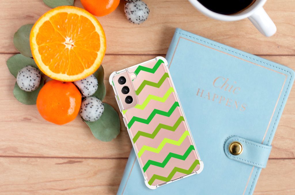 Ben je op zoek naar een uniek telefoonhoesje voor je Samsung Galaxy S21 FE? Dan ben je bij B2C Telecom aan het juiste adres! Speciaal voor jou hebben we dit prachtige Zigzag Groen design in onze collectie hoesjes opgenomen. Het design wordt bedrukt op een Doorzichtige Silicone Hoesje en is gemaakt van flexibel rubber. Het hoesje is perfect voor de actieve smartphonegebruiker door de opstaande randen/hoeken. Denk aan mensen die veel sporten, reizen of wandelen en net iets meer zekerheid willen als het op hun geliefde telefoon aankomt. Het design wordt alleen aan de bovenkant van het hoesje bedrukt en de randen blijven transparant. Aan de zijkanten zijn uitsparingen gemaakt waardoor je met gemak alle knoppen en poorten kunt bedienen. Wij adviseren om dit hoesje in combinatie met een screenprotector te gebruiken voor een langere levensduur van je telefoon. Wil je dit hoesje nog iets extra's geven? Voeg dan gratis je naam of een quote toe! Is dit design hoesje toch niet helemaal wat je zocht? Ontwerp dan zelf een hoesje in ons ontwerpprogramma.