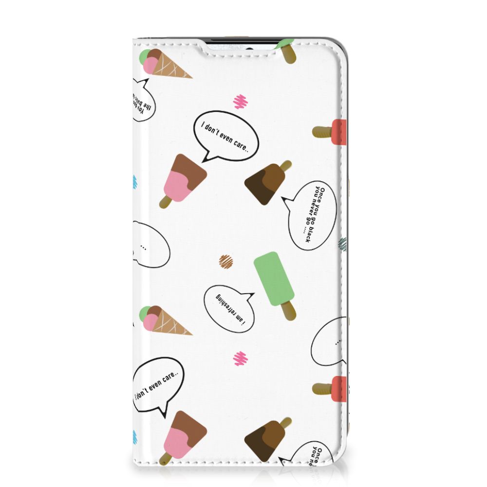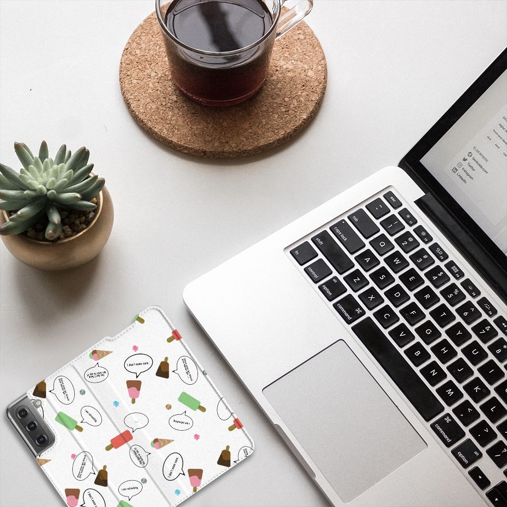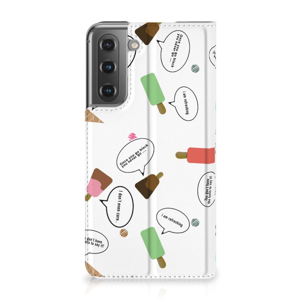 Van deze vrolijke Samsung Galaxy S21 FE Flip Style Cover met daarop verschillende soorten ijsjes met tekstwolkjes krijg je sowieso een vrij en zomers gevoel. De zomer komt naar je toe met deze print van ijsjes met tekstwolkjes. Ben je op het strand, dan ontbreekt een lekker ijsje natuurlijk niet. Net zoals je je smartphone bij de hand hebt, met daaromheen een design hoesje met bijzondere ijsjes en tekstwolkjes. Jouw telefoon kan dan de bescherming in de vorm van een stand case met ijsjes zeer goed gebruiken. Alle zijden van dit hoesje worden bedrukt met ijsjes en dankzij de speciale standaard is het erg prettig om filmpjes te bekijken. De case wordt aan de binnenzijde met een magneet afgesloten en de houder aan de binnenzijde is van TPU. Onder alle weersomstandigheden zal deze case met 1 opbergvakje en ijsjes perfect functioneren, ook op het strand met een ijsje in je hand.