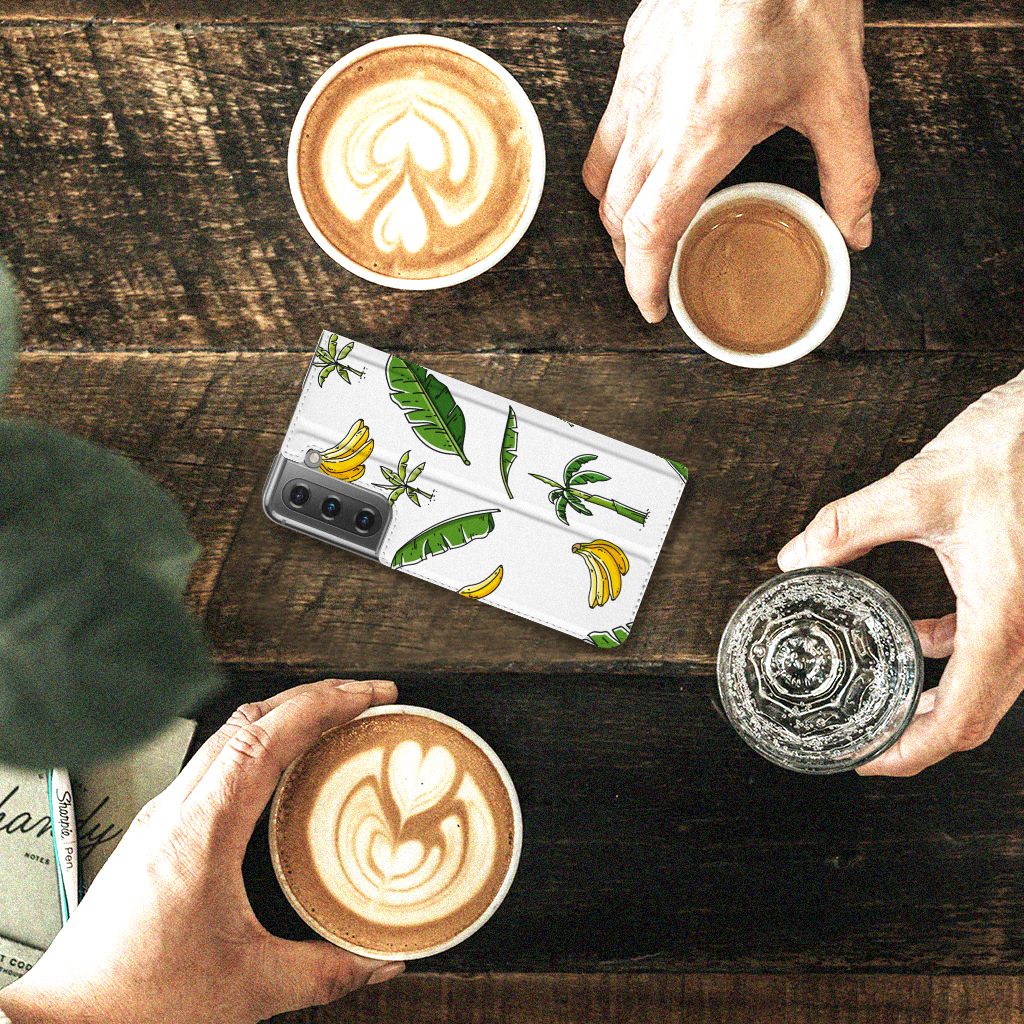Heb jij al zin om op vakantie te gaan? Dat krijg je hoe dan ook als je één blik werpt op dit vrolijke hoesje voor je Samsung Galaxy S21 FE met Banana Tree design. Het fleurige tafereel van bananenbomen, bananenbladeren en bananen doet je gedachten afdwalen naar paradijselijke bountystranden met azuurblauwe zee en helderwitte zandpartijen. Kortom: dit hoesje is goed voor je humeur. Naast het luchtige design zijn daar nog meer redenen voor, want dankzij de stevige materialen weet je zeker dat dit Smart Cover je telefoon altijd optimaal beschermt. De solide hoes van PU-leer beschikt ook over een 1 pashouder en een speciale standaard. Het hoesje wordt afgesloten met een magneet aan de binnenzijde. De houder aan de binnenzijde is van TPU. Alle zijden worden bedrukt. Met dit hoesje breng je jezelf in zomerse sferen en gun je jezelf een krasvrije telefoon.