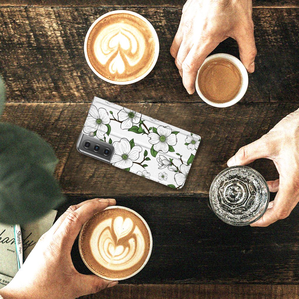 Ben je op zoek naar een uniek telefoonhoesje voor je Samsung Galaxy S21 FE? Dan ben je bij B2C Telecom aan het juiste adres! Speciaal voor jou hebben we dit prachtige Dogwood Flowers design in onze collectie hoesjes opgenomen. Het design wordt bedrukt op een Smart Cover en heeft een vakje aan de binnenkant voor een pasje. Het fijne aan dit hoesje is dat je het als standaard neer kunt zetten. Hierdoor geniet je nog meer als je een filmpje aan het kijken bent op je telefoon. Het hoesje wordt afgesloten door magneten aan de binnenkant. Wil je dit design hoesje nog iets extra's geven? Voeg dan gratis je naam of een quote toe! Is dit design hoesje toch niet helemaal wat je zocht? Ontwerp dan zelf een hoesje in ons ontwerpprogramma.