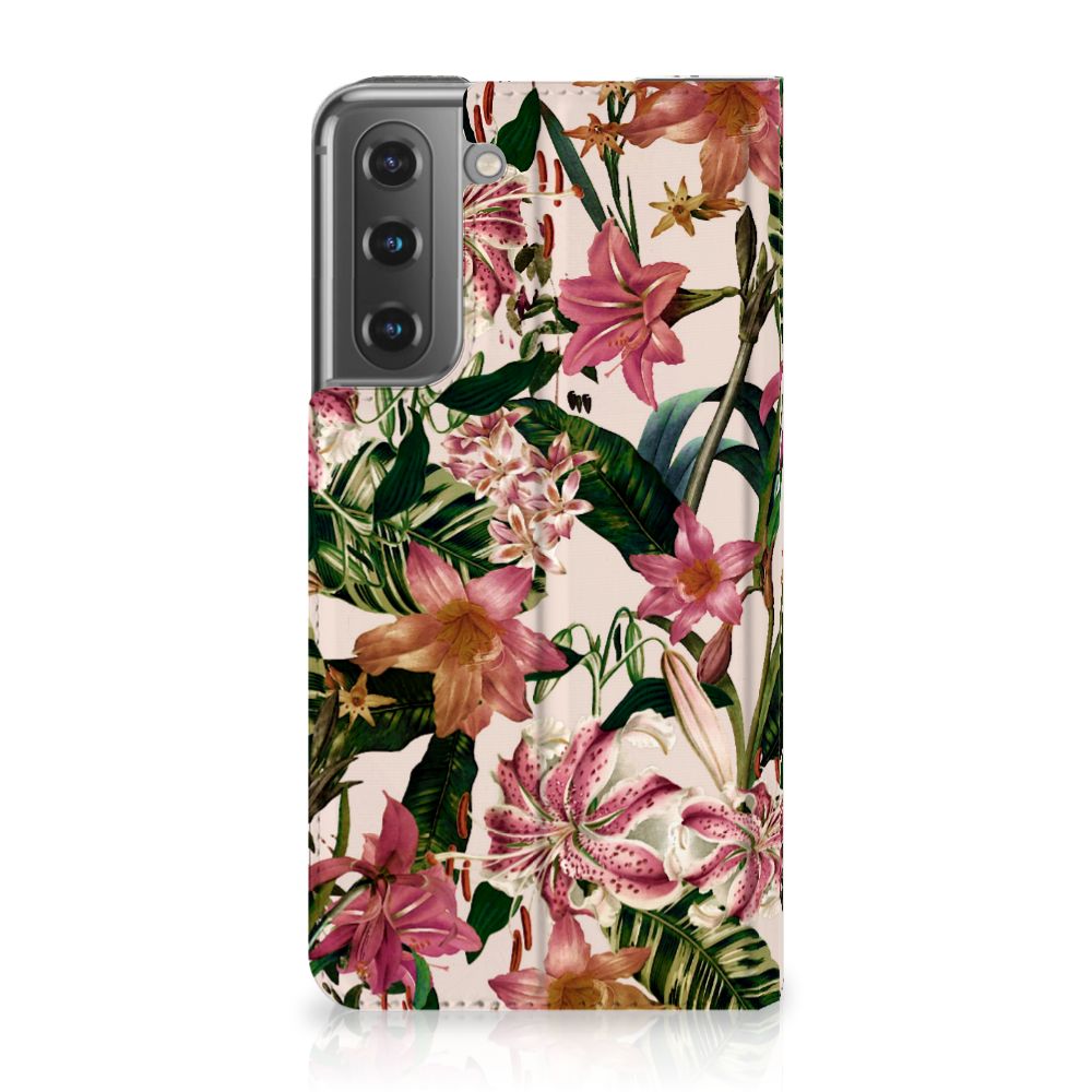 Dit Flowers design is een zegen voor de mens en zijn smartphone. De paarswitte bloemen en groene bladeren op deze Samsung Galaxy S21 FE Smart Cover geven jouw smartphone een zeer sierlijke uitstraling. Je krijgt er meteen een goed gevoel bij als je aan het appen, mailen of aan het bellen bent. Valt dan je telefoon op de grond, dan zal er dankzij de stand case met paarswitte bloemen en groene bladeren geen schade ontstaan. Onze stand cases met paarswitte bloemen en groene bladeren bieden de allerbeste bescherming en zijn heel praktisch, wat blijkt uit onder meer het vakje aan de binnenkant en de handige standaard waarmee je de smartphone rechtop op tafel neer kunt zetten. De paarswitte bloemen en groene bladeren komen op alle zijden van de case te staan. Op deze stand case van leer en TPU (houder aan de binnenkant) kun je in no time zelf foto’s van jouw favoriete bloemen zetten.