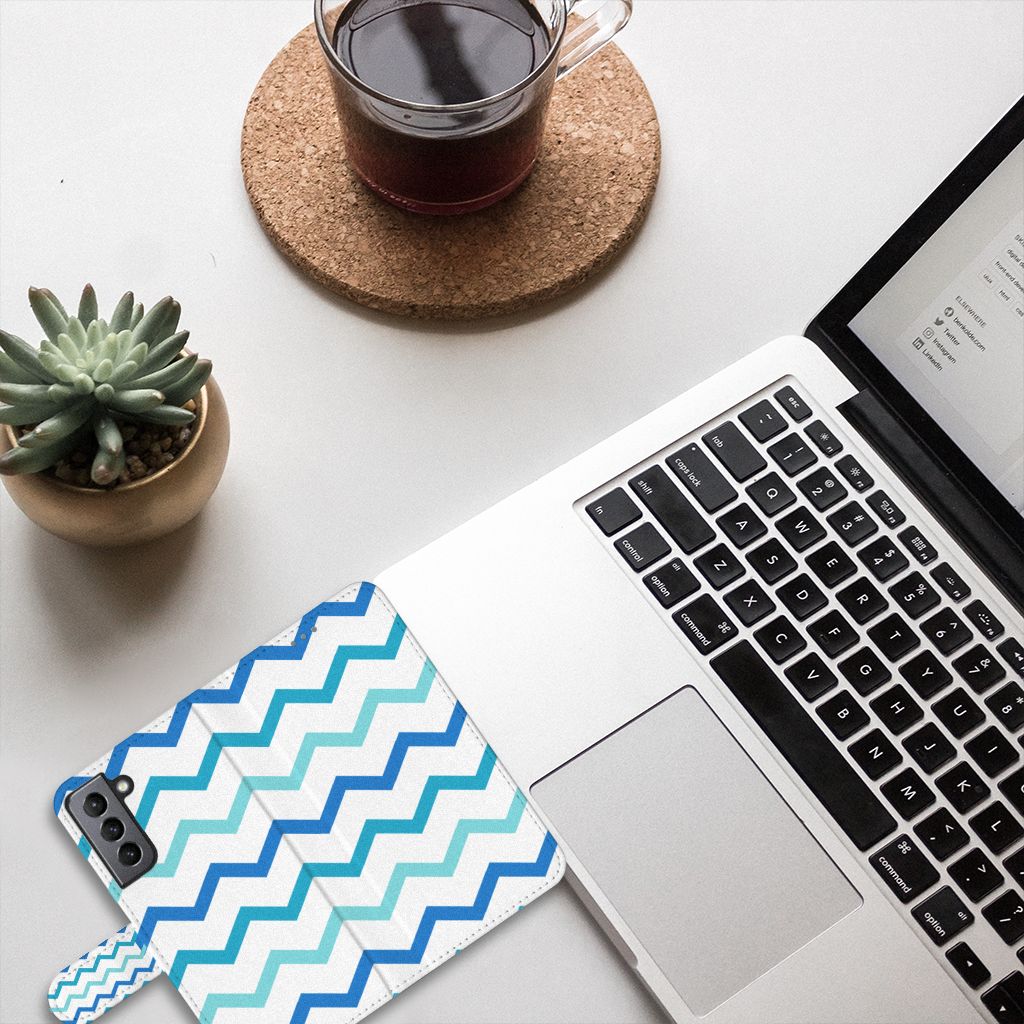 Dit zigzag blauwe design hoesje is speciaal ontworpen voor jou. We hebben bewust verschillende stijlen blauw gebruikt, zodat er voldoende sprake is van variatie. Dit blauwwitte Telefoon Hoesje ziet er super strak uit. Dat kan ook niet anders, als je weet dat onze zeer talentvolle designer er hoogstpersoonlijk voor verantwoordelijk is. Hij schudt wekelijks nieuwe designs uit zijn mouw en dit zigzag blauwe hoesje is een van zijn fraaiste creaties. Een heel dik design hoesje, al zeggen we het zelf. Valt dit blauwwitte design hoesje goed bij jou? Bestel het dan vandaag nog en je hebt het morgen in huis. Het design staat op een boekhoesje. Dit smartphonehoesje beschermt jouw Samsung Galaxy S21 FE aan alle zijden en beschikt over verschillende opbergvakjes voor pasjes en briefgeld. De case sluit perfect af met het lipje aan de buitenkant. De houder aan de binnenzijde is van TPU. Alle zijden van het hoesje worden bedrukt, inclusief het lipje.