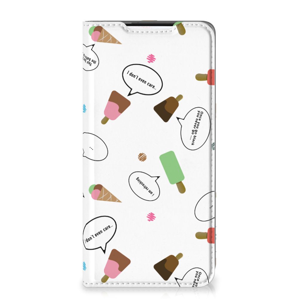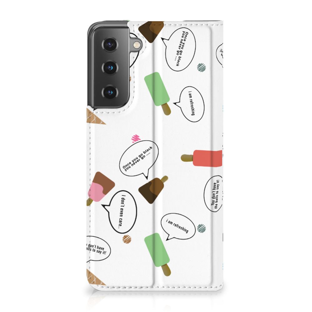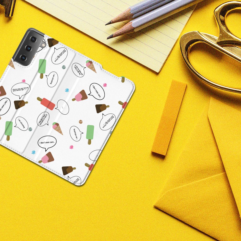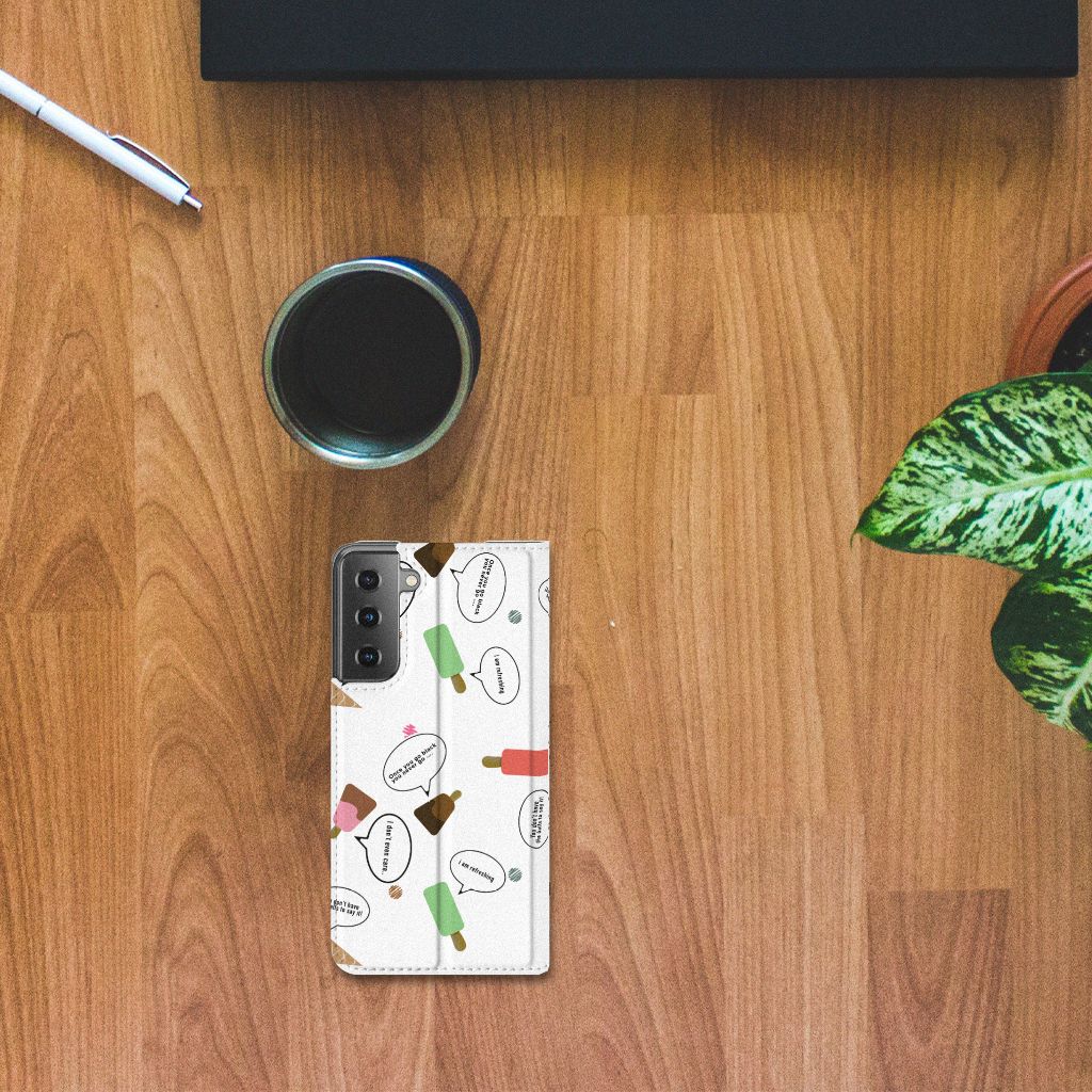 Van deze vrolijke Samsung Galaxy S21 Flip Style Cover met daarop verschillende soorten ijsjes met tekstwolkjes krijg je sowieso een vrij en zomers gevoel. De zomer komt naar je toe met deze print van ijsjes met tekstwolkjes. Ben je op het strand, dan ontbreekt een lekker ijsje natuurlijk niet. Net zoals je je smartphone bij de hand hebt, met daaromheen een design hoesje met bijzondere ijsjes en tekstwolkjes. Jouw telefoon kan dan de bescherming in de vorm van een stand case met ijsjes zeer goed gebruiken. Alle zijden van dit hoesje worden bedrukt met ijsjes en dankzij de speciale standaard is het erg prettig om filmpjes te bekijken. De case wordt aan de binnenzijde met een magneet afgesloten en de houder aan de binnenzijde is van TPU. Onder alle weersomstandigheden zal deze case met 1 opbergvakje en ijsjes perfect functioneren, ook op het strand met een ijsje in je hand.