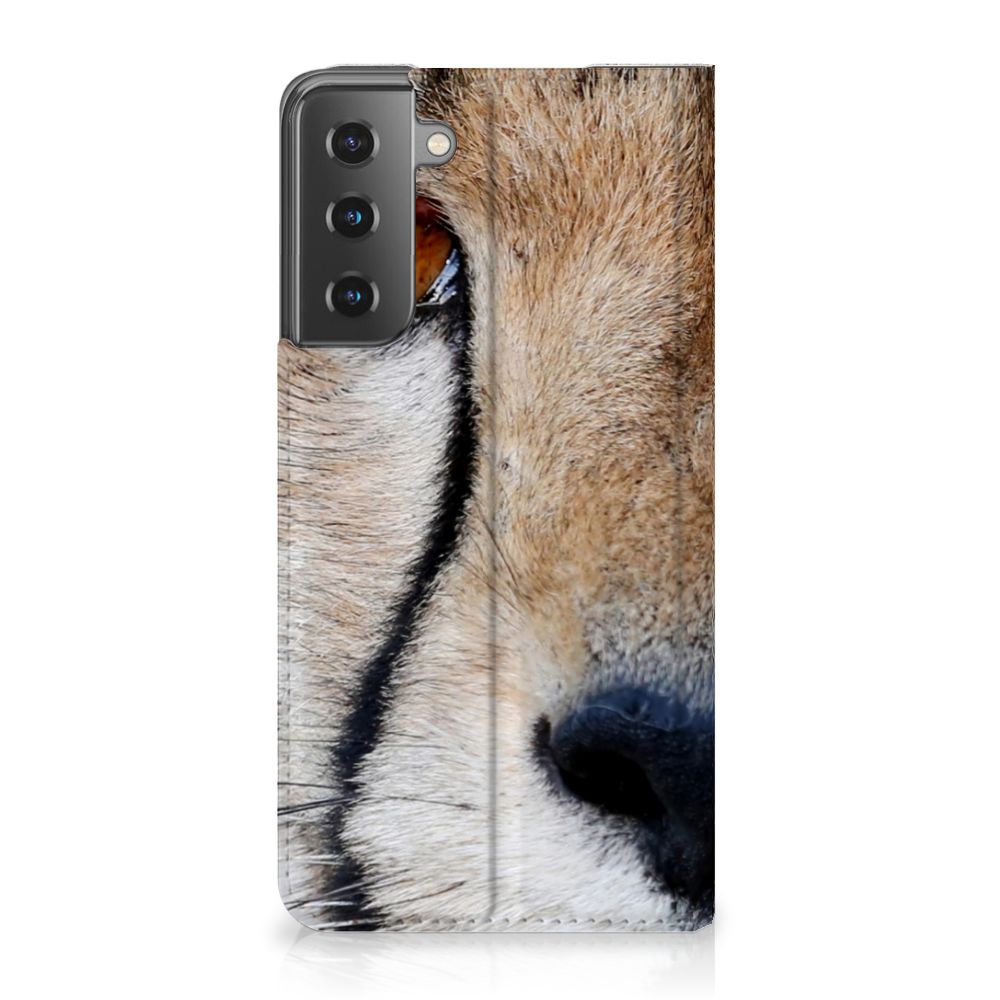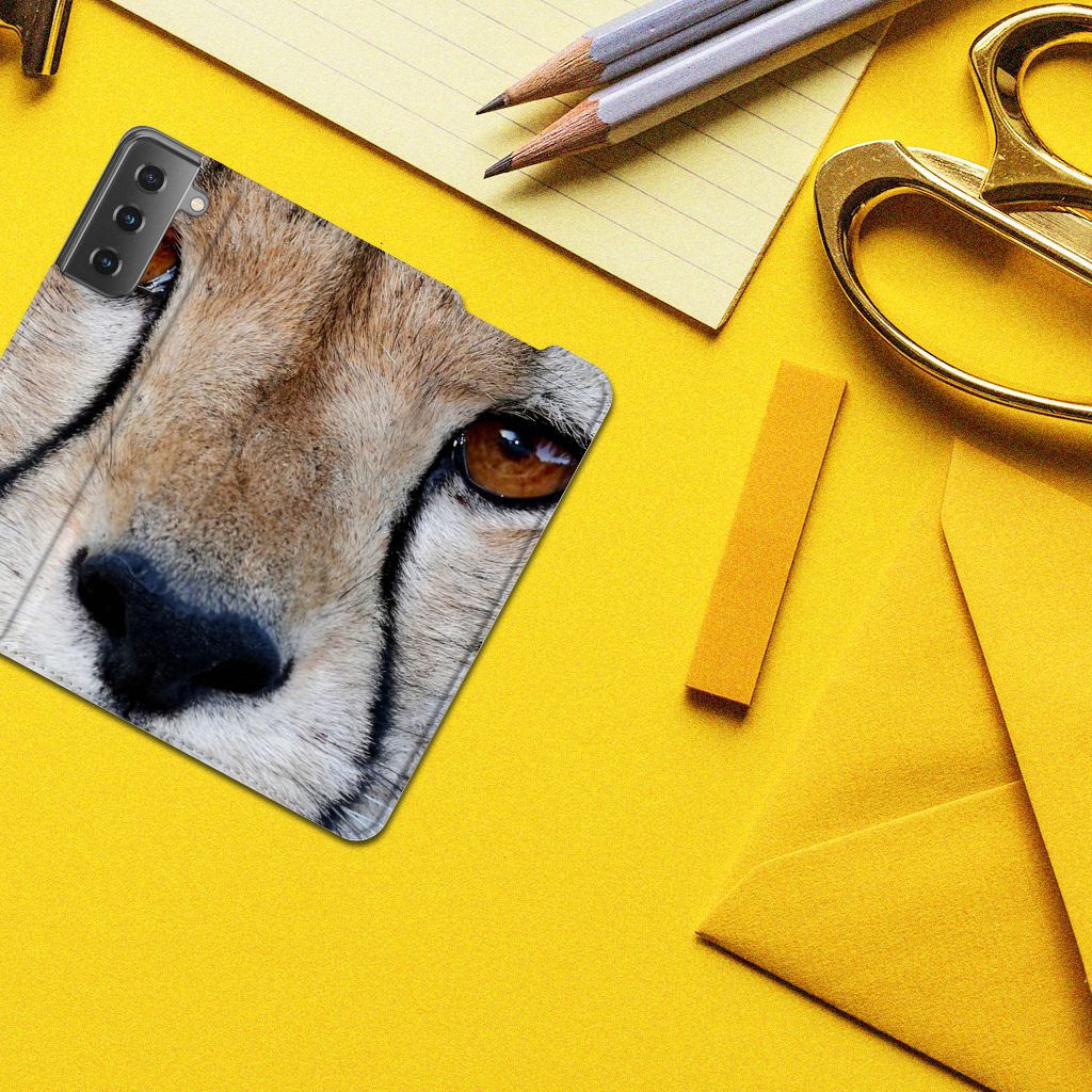 Wist je dat een cheetah, ook wel jachtluipaard genoemd, een topsnelheid van 120 km/u kan halen? Dit maakt de cheetah tot het snelste landdier ter wereld. Dit design hoesje met cheetah print kunnen we dus met recht zeer flitsend noemen. Dit komt niet alleen door de foto van het jachtluipaard, maar ook door de uitstraling van het hoesje. De close up van het dier hebben we op een stand case gezet. Dit is een multifunctionele case, met een vakje aan de binnenzijde waarin je een pasje kwijt kunt. Hiermee is de kous nog niet af, want een Samsung Galaxy S21 Hoesje maken wordt aan de binnenzijde magnetisch afgesloten en heeft een standaard. De vacht van jachtluipaarden is bedekt met ronde, zwarte vlekjes. Hierdoor valt het dier in zijn natuurlijke leefomgeving zo min mogelijk op. Jij doet dat zeker wel, met deze stand case met design. De buitenzijde is van leer, de houder aan de binnenzijde van TPU.