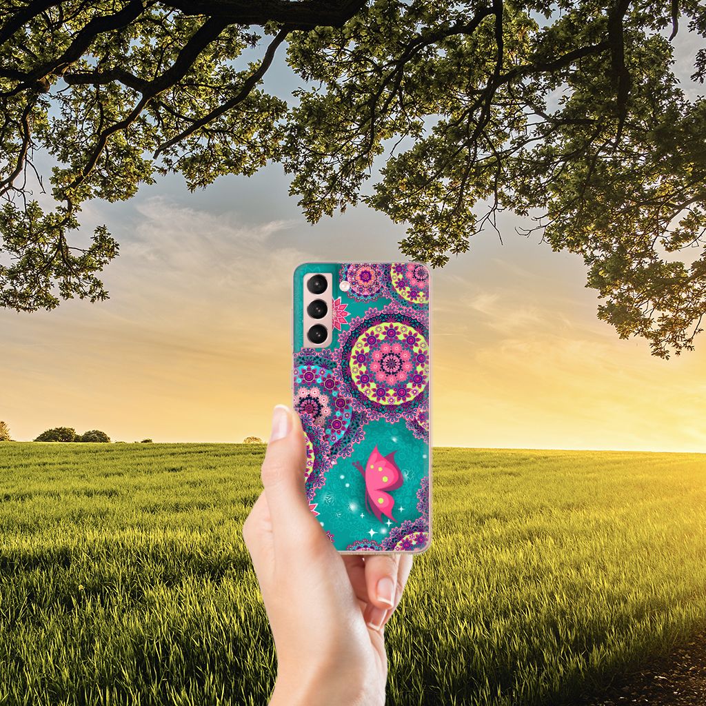 Deze opvallende Samsung Galaxy S21 Hoesje maken met Cirkels en Vlinders is een ware eyecatcher. De meeste vlinders hebben een onopvallende vleugelkleur en dat kun je van de soort op dit hoesje ook zeker wel zeggen. Wij kunnen deze opvallende vlinders en cirkels op een zeer handige tpu case zetten. Deze hoesjes zijn gewild omwille hun flexibiliteit. Met onze geavanceerde printer zetten we de print van opvallende vlinders en cirkels op de achterkant van het hoesje. De case met vlinders en cirkels blijft aan de zijkanten doorzichtig, zodat je maximaal het design van je smartphone behoudt. Verder is je telefoon natuurlijk goed beschermd met deze tpu case met print van blauwe vlinders. De bovenkant wordt bedrukt, de zijkanten niet. Met een screenprotector bescherm je ook het scherm maximaal.