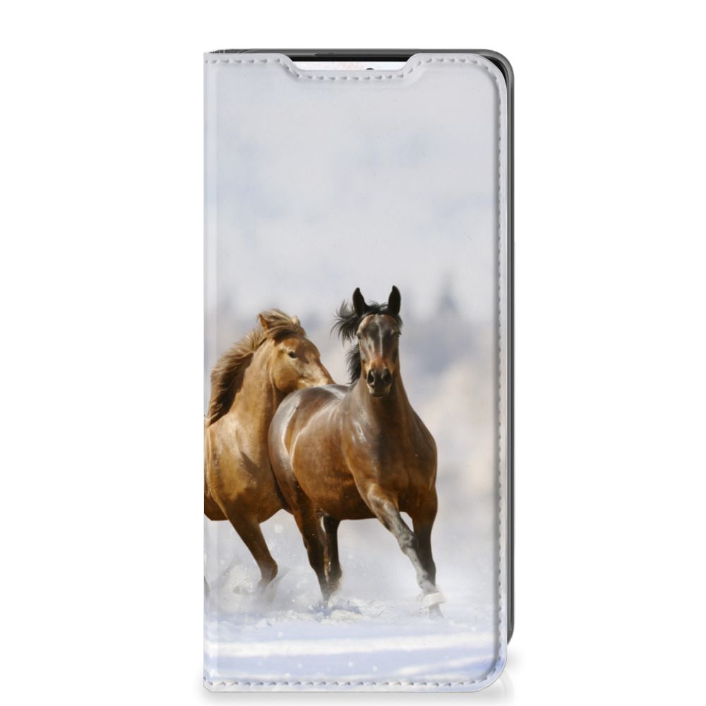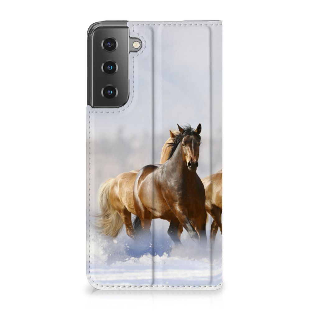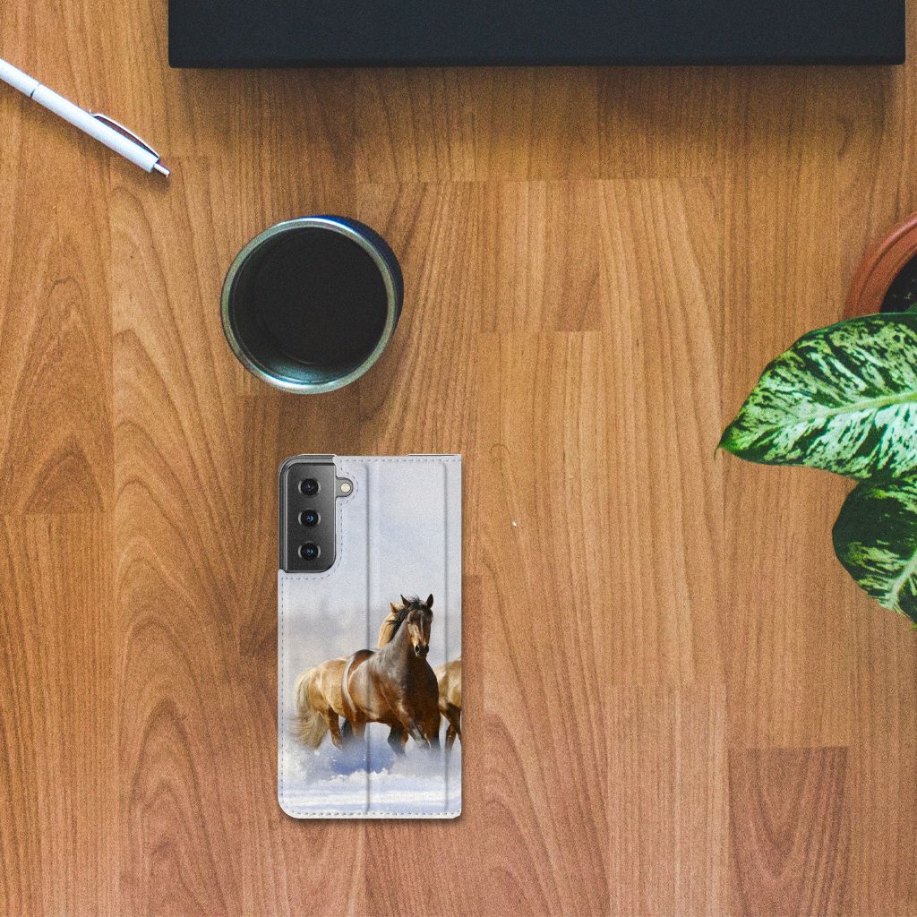 Voor de paardenliefhebbers onder ons hebben we onze collectie uitgebreid met dit design hoesje met print van paarden. Vroeger hield de mens vooral werkpaarden, inmiddels hebben we vriendschap gesloten met het paard. Vandaar dat het ook een favoriet dier is op onze smartphonehoesjes, zoals deze stand cases. Deze Samsung Galaxy S21 Hoesje maken met Paarden is niet alleen super mooi en chique, het sluit ook nog perfect dankzij de magneet aan de binnenzijde. Verder heeft de case een TPU houder aan de binnenzijde en een houder voor een pasje. Zie je liever je eigen paard terug op een hoesje? Dat kan! Door zelf een uniek hoesje te ontwerpen, met eigen foto’s en teksten. De stand case met paarden wordt aan alle zijden bedrukt.