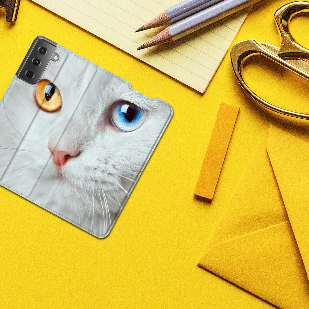 Witte katten zijn natuurlijk extra speciaal, vandaar we een exemplaar op een design hoesje hebben gezet. Een witte kat schijnt trouwens ook slechter te kunnen horen dan katten met een andere kleur. Deze witte kat staat op een zeer prominente wijze op een stand case. Deze stand case met witte kat ziet er geweldig uit en is voorzien van verschillende uitsparingen en een speciale standaard. Een Samsung Galaxy S21 Hoesje maken met witte kat beschermt jouw smartphone perfect. Alle zijden van de case zijn bedrukt. Jouw smartphone wordt erg duurzaam met dit design hoesje. Het TPU aan de binnenzijde is zeer flexibel en het pu-leer oogt chique. Verder heeft de case een houder voor bijvoorbeeld je rijbewijs aan de binnenkant.