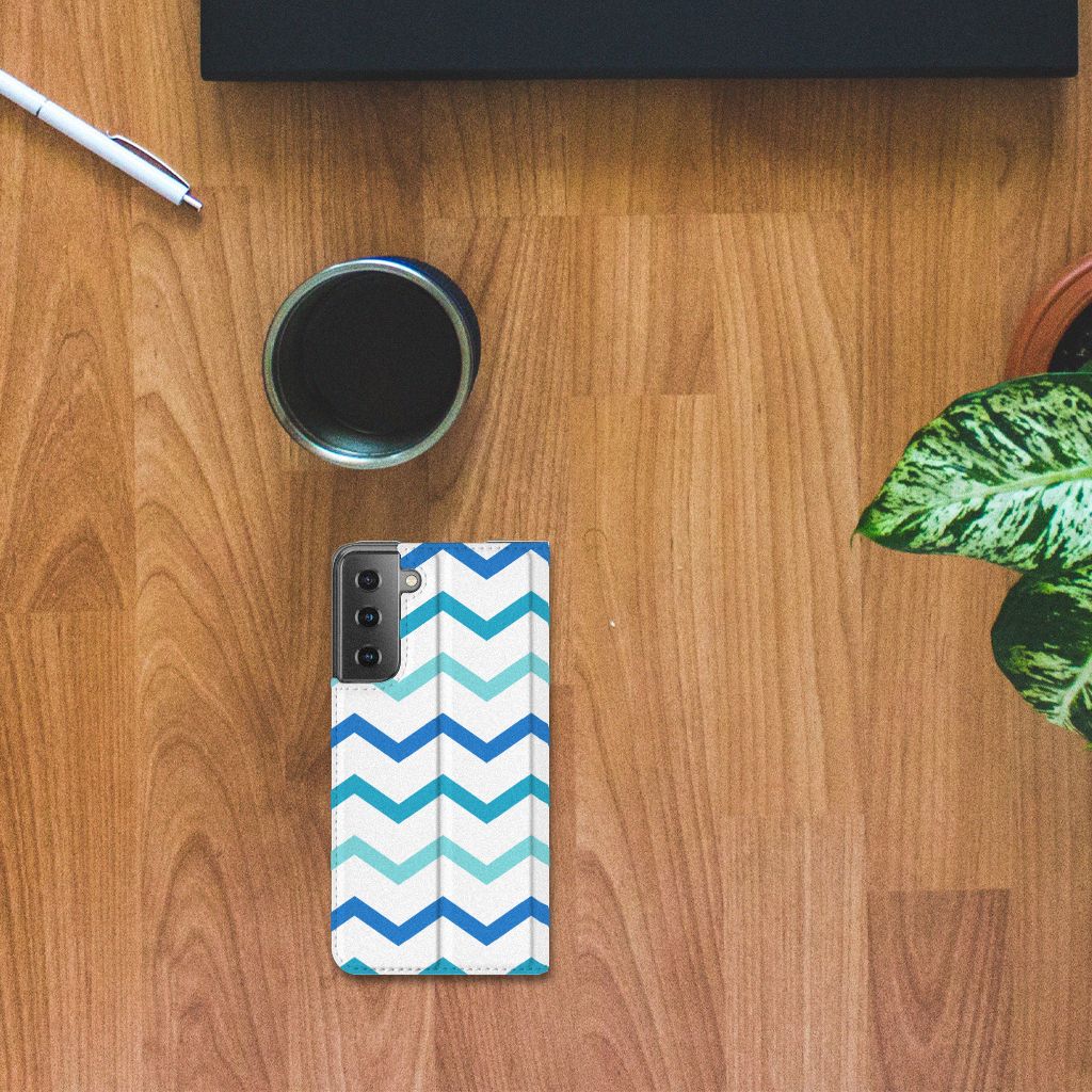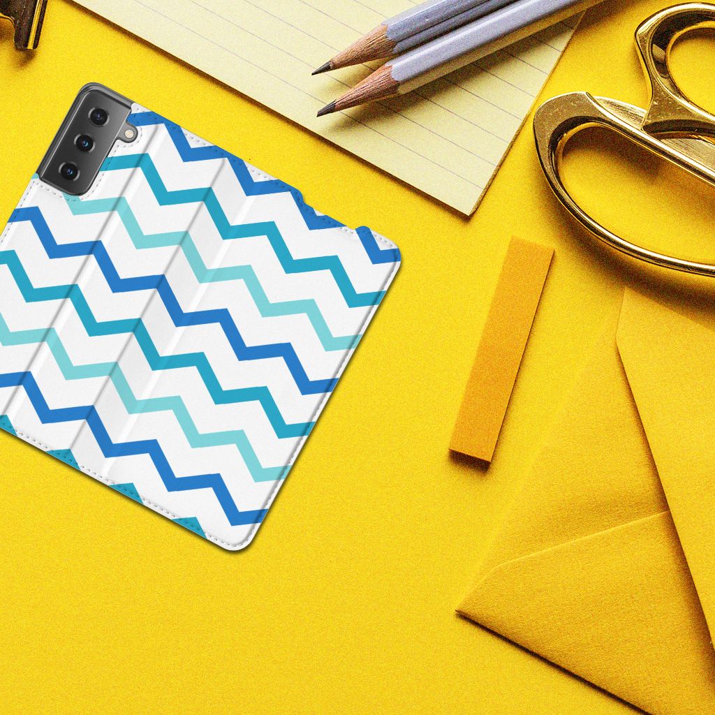 Dit zigzag blauwe design hoesje is speciaal ontworpen voor jou. We hebben bewust verschillende stijlen blauw gebruikt, zodat er voldoende sprake is van variatie. Dit blauwwitte Hoesje met Magneet ziet er super strak uit. Dat kan ook niet anders, als je weet dat onze zeer talentvolle designer er hoogstpersoonlijk voor verantwoordelijk is. Hij schudt wekelijks nieuwe designs uit zijn mouw en dit zigzag blauwe hoesje is een van zijn fraaiste creaties. Een heel dik design hoesje, al zeggen we het zelf. Valt dit blauwwitte design hoesje goed bij jou? Bestel het dan vandaag nog en je hebt het morgen in huis. Het design staat op een stand case. Deze case beschermt jouw Samsung Galaxy S21 aan alle kanten en beschikt over een 1 opbergvakje en een speciale standaard. Het hoesje wordt afgesloten met een magneet aan de binnenzijde. De houder aan de binnenzijde is van TPU. Alle zijden van de stand case worden bedrukt.