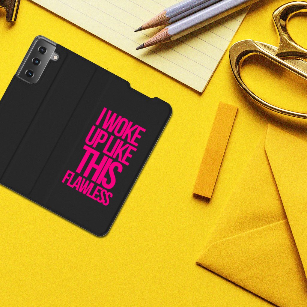 Met deze zwarte Samsung Galaxy S21 Hoesje met tekst met deze paarse tekst kun je met recht trots zijn. De case komt als geroepen voor jouw smartphone. Met dit zwarte design hoesje met Woke Up tekst heb je een zeer solide product in handen. Dit zeer populaire smartphone hoesje heeft 1 vakje en is aan alle zijden bedrukt. Verder heeft de case een standaard en een magneet aan de binnenkant. De houder is van TPU, de buitenzijde van PU-leer. We willen je er ook op wijzen dat je zelf een hoesje kunt ontwerpen, met eigen beelden en teksten. Met onze Phone Case Designer kun je zelfs opvallende effecten, patronen en clip arts aan het ontwerp toevoegen.