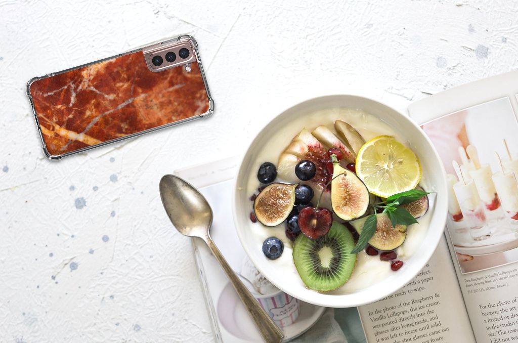 Ben je op zoek naar een uniek telefoonhoesje voor je Samsung Galaxy S21 Plus? Dan ben je bij B2C Telecom aan het juiste adres! Speciaal voor jou hebben we dit prachtige Marmer Bruin design in onze collectie hoesjes opgenomen. Het design wordt bedrukt op een Anti-Shock Hoesje en is gemaakt van flexibel rubber. Het hoesje is perfect voor de actieve smartphonegebruiker door de opstaande randen/hoeken. Denk aan mensen die veel sporten, reizen of wandelen en net iets meer zekerheid willen als het op hun geliefde telefoon aankomt. Het design wordt alleen aan de bovenkant van het hoesje bedrukt en de randen blijven transparant. Aan de zijkanten zijn uitsparingen gemaakt waardoor je met gemak alle knoppen en poorten kunt bedienen. Wij adviseren om dit hoesje in combinatie met een screenprotector te gebruiken voor een langere levensduur van je telefoon. Wil je dit hoesje nog iets extra's geven? Voeg dan gratis je naam of een quote toe! Is dit design hoesje toch niet helemaal wat je zocht? Ontwerp dan zelf een hoesje in ons ontwerpprogramma.