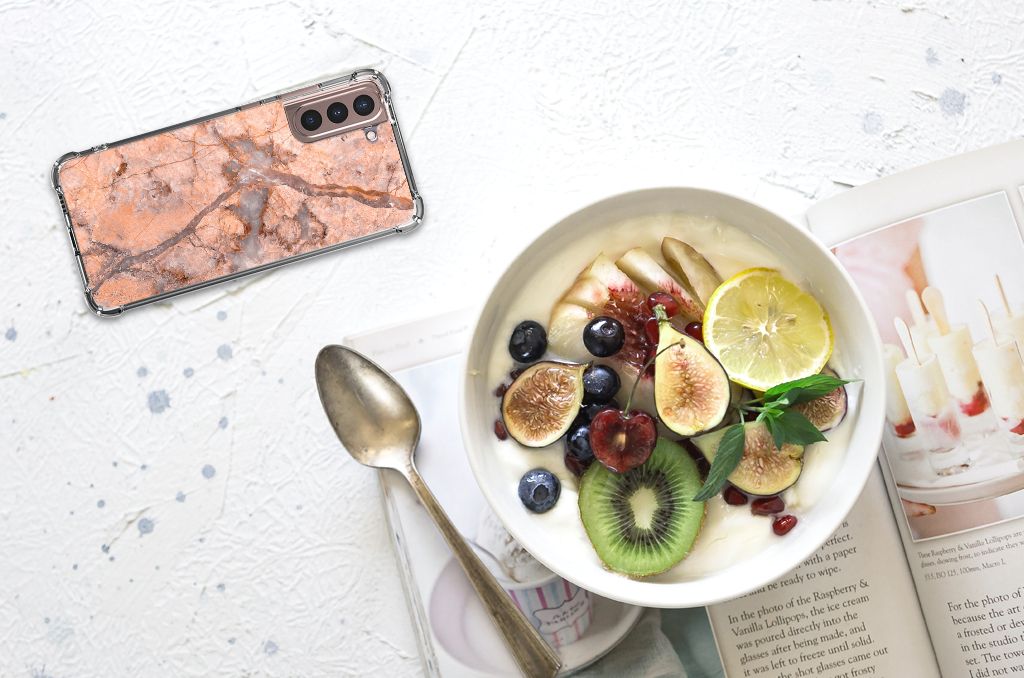 Ben je op zoek naar een uniek telefoonhoesje voor je Samsung Galaxy S21 Plus? Dan ben je bij B2C Telecom aan het juiste adres! Speciaal voor jou hebben we dit prachtige Marmer Oranje design in onze collectie hoesjes opgenomen. Het design wordt bedrukt op een Anti-Shock Hoesje en is gemaakt van flexibel rubber. Het hoesje is perfect voor de actieve smartphonegebruiker door de opstaande randen/hoeken. Denk aan mensen die veel sporten, reizen of wandelen en net iets meer zekerheid willen als het op hun geliefde telefoon aankomt. Het design wordt alleen aan de bovenkant van het hoesje bedrukt en de randen blijven transparant. Aan de zijkanten zijn uitsparingen gemaakt waardoor je met gemak alle knoppen en poorten kunt bedienen. Wij adviseren om dit hoesje in combinatie met een screenprotector te gebruiken voor een langere levensduur van je telefoon. Wil je dit hoesje nog iets extra's geven? Voeg dan gratis je naam of een quote toe! Is dit design hoesje toch niet helemaal wat je zocht? Ontwerp dan zelf een hoesje in ons ontwerpprogramma.