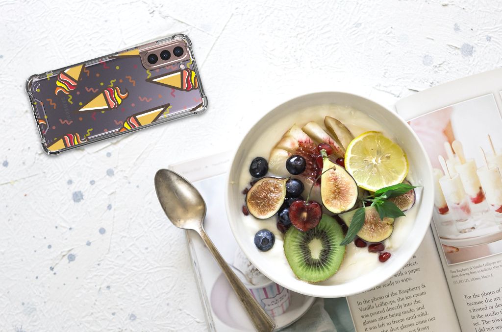Ben je op zoek naar een uniek telefoonhoesje voor je Samsung Galaxy S21 Plus? Dan ben je bij B2C Telecom aan het juiste adres! Speciaal voor jou hebben we dit prachtige Icecream design in onze collectie hoesjes opgenomen. Het design wordt bedrukt op een Beschermhoes en is gemaakt van flexibel rubber. Het hoesje is perfect voor de actieve smartphonegebruiker door de opstaande randen/hoeken. Denk aan mensen die veel sporten, reizen of wandelen en net iets meer zekerheid willen als het op hun geliefde telefoon aankomt. Het design wordt alleen aan de bovenkant van het hoesje bedrukt en de randen blijven transparant. Aan de zijkanten zijn uitsparingen gemaakt waardoor je met gemak alle knoppen en poorten kunt bedienen. Wij adviseren om dit hoesje in combinatie met een screenprotector te gebruiken voor een langere levensduur van je telefoon. Wil je dit hoesje nog iets extra's geven? Voeg dan gratis je naam of een quote toe! Is dit design hoesje toch niet helemaal wat je zocht? Ontwerp dan zelf een hoesje in ons ontwerpprogramma.