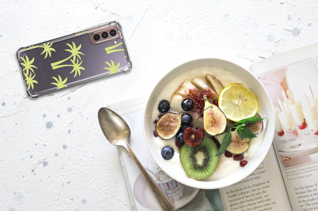 Ben je op zoek naar een uniek telefoonhoesje voor je Samsung Galaxy S21 Plus? Dan ben je bij B2C Telecom aan het juiste adres! Speciaal voor jou hebben we dit prachtige Palmtrees design in onze collectie hoesjes opgenomen. Het design wordt bedrukt op een Case en is gemaakt van flexibel rubber. Het hoesje is perfect voor de actieve smartphonegebruiker door de opstaande randen/hoeken. Denk aan mensen die veel sporten, reizen of wandelen en net iets meer zekerheid willen als het op hun geliefde telefoon aankomt. Het design wordt alleen aan de bovenkant van het hoesje bedrukt en de randen blijven transparant. Aan de zijkanten zijn uitsparingen gemaakt waardoor je met gemak alle knoppen en poorten kunt bedienen. Wij adviseren om dit hoesje in combinatie met een screenprotector te gebruiken voor een langere levensduur van je telefoon. Wil je dit hoesje nog iets extra's geven? Voeg dan gratis je naam of een quote toe! Is dit design hoesje toch niet helemaal wat je zocht? Ontwerp dan zelf een hoesje in ons ontwerpprogramma.