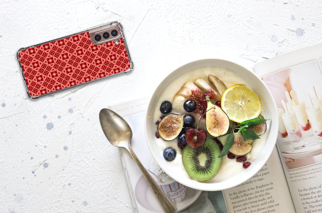 Ben je op zoek naar een uniek telefoonhoesje voor je Samsung Galaxy S21 Plus? Dan ben je bij B2C Telecom aan het juiste adres! Speciaal voor jou hebben we dit prachtige Batik Red design in onze collectie hoesjes opgenomen. Het design wordt bedrukt op een Doorzichtige Silicone Hoesje en is gemaakt van flexibel rubber. Het hoesje is perfect voor de actieve smartphonegebruiker door de opstaande randen/hoeken. Denk aan mensen die veel sporten, reizen of wandelen en net iets meer zekerheid willen als het op hun geliefde telefoon aankomt. Het design wordt alleen aan de bovenkant van het hoesje bedrukt en de randen blijven transparant. Aan de zijkanten zijn uitsparingen gemaakt waardoor je met gemak alle knoppen en poorten kunt bedienen. Wij adviseren om dit hoesje in combinatie met een screenprotector te gebruiken voor een langere levensduur van je telefoon. Wil je dit hoesje nog iets extra's geven? Voeg dan gratis je naam of een quote toe! Is dit design hoesje toch niet helemaal wat je zocht? Ontwerp dan zelf een hoesje in ons ontwerpprogramma.