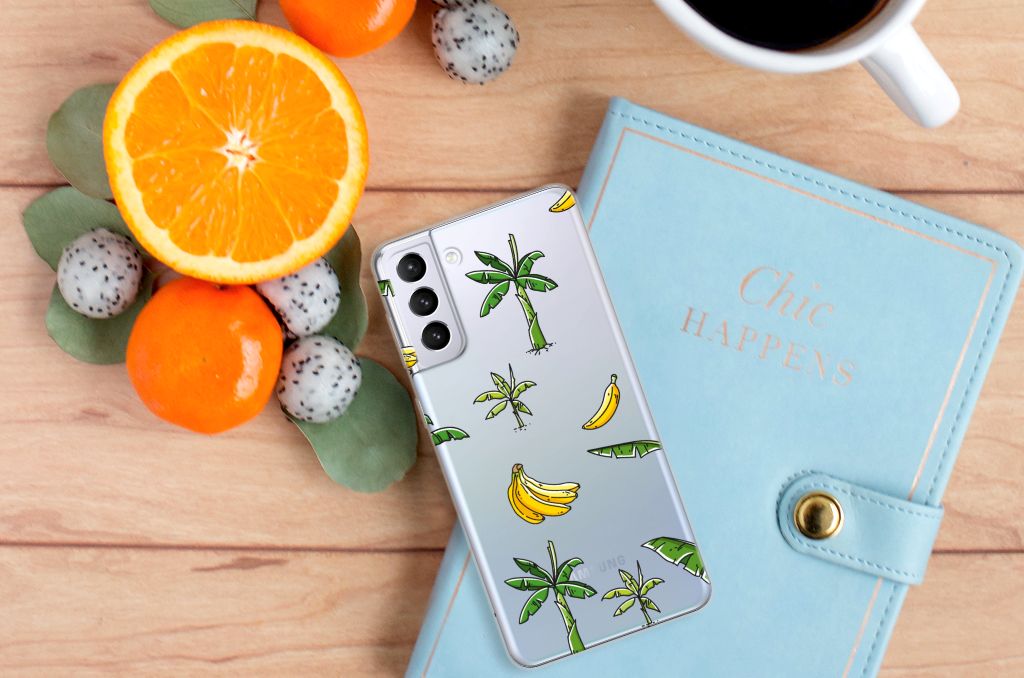 Heb jij al zin om op vakantie te gaan? Dat krijg je hoe dan ook als je één blik werpt op dit vrolijke hoesje voor je Samsung Galaxy S21 Plus met Banana Tree design. Het fleurige tafereel van bananenbomen, bananenbladeren en bananen doet je gedachten afdwalen naar paradijselijke bountystranden met azuurblauwe zee en helderwitte zandpartijen. Kortom: dit hoesje is goed voor je humeur. Naast het luchtige design zijn daar nog meer redenen voor, want dankzij de stevige materialen weet je zeker dat dit TPU Case je telefoon altijd optimaal beschermt Dit hoesje wordt alleen aan de bovenkant bedrukt en is zeer flexibel. De randen van het hoesje blijven transparant. Met dit hoesje breng je jezelf in zomerse sferen en gun je jezelf een krasvrije telefoon.