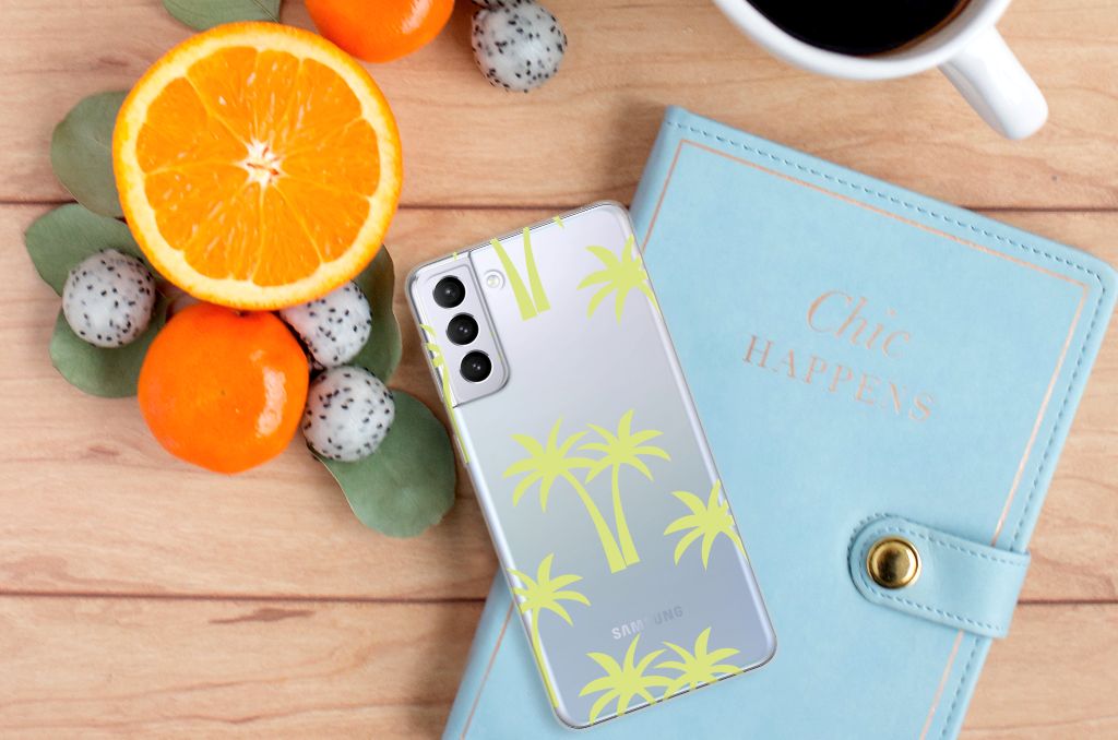 Je krijgt direct een vakantiegevoel als je kiest voor een Samsung Galaxy S21 Plus TPU Case met opdruk van lichtgroene Palmtrees. Sommige mensen hebben ook een palmboom in hun tuin staan, wij kunnen er meerdere op een tpu case zetten. Jouw smartphone is op en top beschermd met een tpu case met lichtgroene palmbomen tegen een witgrijze achtergrond en ziet er schitterend uit. Het is heel verstandig je telefoon te beschermen met een tpu hoesje met palmbomen tegen een witgrijze achtergrond. De TPU case met print van lichtgroene palmbomen beschermt jouw telefoon voornamelijk aan de achterzijde. De randen van de case worden niet bedrukt met lichtgroene palmbomen. TPU is zeer flexibel.