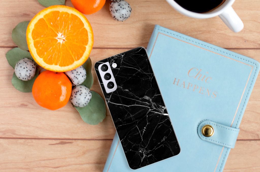 Dit design hoesje met Marmer Zwart is voor de artistieke personen onder ons. De Grieken en Romeinen wisten het materiaal al te waarderen door het in de bouw toe te passen. Naast het witte marmer met haar zacht grijze geaderde belijning zijn de diverse soorten in een gevarieerd kleurenpallet te krijgen. We hebben mooie kleuren op design hoesjes gezet, zoals in dit geval zwart marmer. Dit is een Samsung Galaxy S21 Plus TPU Siliconen Hoesje met marmer in bruine kleur. Het marmer wordt bedrukt op de voorkant van een tpu case, die beschikt over opstaande randen aan de voorkant en heel goed combineert met een screenprotector van glas of van folie. De rijkdom aan kleuren en varianties in afwerking geeft ontwerpers de vrijheid om met marmer hele mooie architectonische projecten te realiseren. Wij hebben onze designer tevens veel vrijheid gegeven. Het resultaat zie je terug in deze tpu case met zwart marmer, die jouw smartphone goed beschermt. De zijkanten van de case worden niet bedrukt met het zwarte marmer.