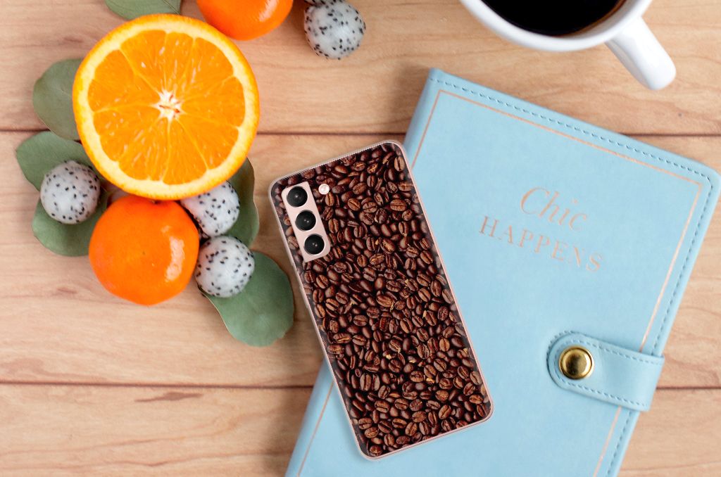 Als je de lekkerste koffie wilt dan kun je beste koffiebonen kopen. Koffie is namelijk het verst wanneer je de bonen zelf maalt. En wie houdt nou niet van de geur van vers gemaalde koffie? Daarom hebben wij de mooiste Koffiebonen op een smartphone hoesje gezet. Ben je barista, dan is dit het perfecte hoesje voor jouw werktelefoon. De koffiebonen staan op een tpu case. Dit is een zeer flexibel hoesje, dat altijd en overal in je broekzak past. Alleen de bovenkant van dit hoesje wordt door ons bedrukt, op zeer duurzame manier. Mensen die houden van een stevige espresso, kiezen voor dit degelijke design hoesje met bonen. Er staan geen bonen op de zijkanten van een Samsung Galaxy S21 Siliconen Case. Wel kun je zelf een eigen tekst toevoegen aan het design. Hoe mooi is dat?