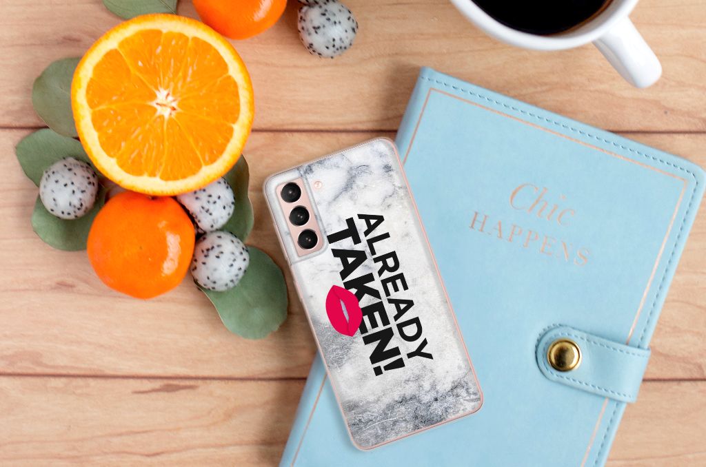 Stel dat je opdringende vrouwen of mannen van je af wil schudden op het moment dat je aan het feesten bent, omdat je al een partner hebt. Dan kun je dat met dit hoesje uitstekend duidelijk maken. Je Samsung Galaxy S21 neem je waarschijnlijk vaak ter hand, dus dan zal de boodschap als je over dit hoesje beschikt zeker weten overkomen. Ook in het openbaar vervoer zal dit hoesje ervoor zorgen dat je minder snel versierd wordt door het andere geslacht. Als je vrijgezel bent en op zoek naar gezelschap, dan kun je beter kiezen voor een ander hoesje uit ons ruime en gevarieerde assortiment. Het design Already Taken White staat op een Siliconen hoesje met naam. Dit hoesje wordt alleen aan de bovenkant bedrukt en is zeer flexibel. De randen van het hoesje blijven transparant.