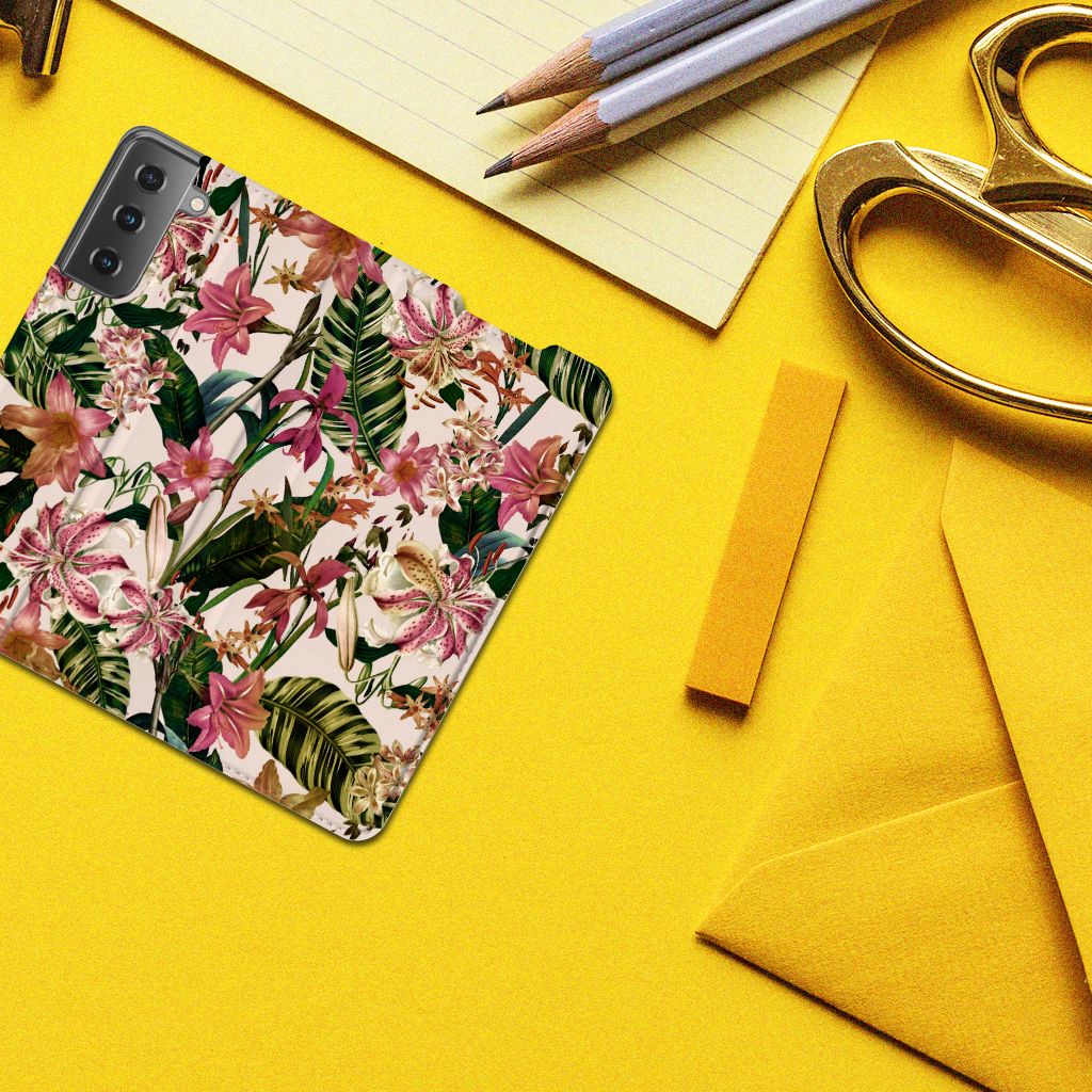 Dit Flowers design is een zegen voor de mens en zijn smartphone. De paarswitte bloemen en groene bladeren op deze Samsung Galaxy S21 Smart Cover geven jouw smartphone een zeer sierlijke uitstraling. Je krijgt er meteen een goed gevoel bij als je aan het appen, mailen of aan het bellen bent. Valt dan je telefoon op de grond, dan zal er dankzij de stand case met paarswitte bloemen en groene bladeren geen schade ontstaan. Onze stand cases met paarswitte bloemen en groene bladeren bieden de allerbeste bescherming en zijn heel praktisch, wat blijkt uit onder meer het vakje aan de binnenkant en de handige standaard waarmee je de smartphone rechtop op tafel neer kunt zetten. De paarswitte bloemen en groene bladeren komen op alle zijden van de case te staan. Op deze stand case van leer en TPU (houder aan de binnenkant) kun je in no time zelf foto’s van jouw favoriete bloemen zetten.