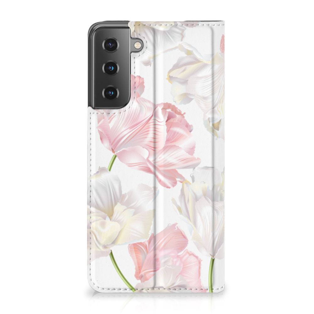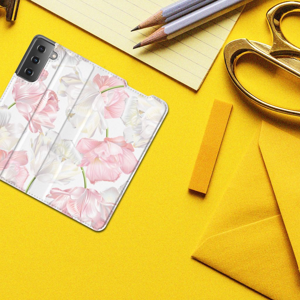 Een bosje bloemen doet een mens (en zijn smartphone) goed. De witte en roze bloemen op dit Samsung Galaxy S21 Smart Cover geven jouw smartphone een zeer mooie uitstraling. Je wordt er ook meteen een stuk rustiger van als je aan het appen of aan het bellen bent. Valt dan je telefoon op de grond, dan zal er dankzij de stand case met het design Lovely Flowers ontstaan. Onze stand cases met roze en witte bloemen zien er zeer prettig uit en zijn heel praktisch, wat blijkt uit onder meer het vakje aan de binnenkant en de handige standaard waarmee je de smartphone rechtop op tafel neer kunt zetten. De roze en witte bloemen passen goed op alle zijden van de case. Op deze stand case van leer en TPU (houder aan de binnenkant) kun je trouwens ook je eigen bloemige ontwerp zetten. In een paar simpele stappen maak je zelf een stand hoesje met daarop jouw mooiste bloemen.