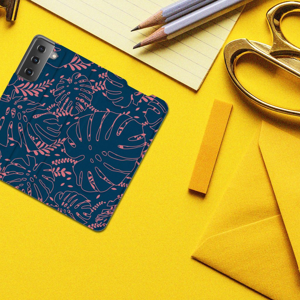 Je voelt je verbonden met de natuur als je kiest voor deze Samsung Galaxy S21 Smart Cover met print van roze bladeren op een blauwe achtergrond. De print bestaat uit verschillende roze bladeren en dit zorgt voor een fraai decoratief geheel. Met dit patroon van roze bladeren op een blauwe achtergrond creëer je een opvallende uitstraling voor jouw smartphone. Jij doet er verstandig aan om je telefoon te beschermen met dit design hoesje met roze bladeren op een blauwe achtergrond, die staan op een stand case. Dit hoesje kenmerkt zich onder meer door het handige vakje aan de binnenzijde en de magnetische sluiting aan de binnenzijde. Voel jij jezelf happy bij een beeld van roze bladeren op een blauwe achtergrond, dan is deze stand case met print een uitstekende optie. Het beschermt jouw telefoon aan alle zijden. Het TPU aan de binnenzijde klemt zich perfect om jouw smartphone.