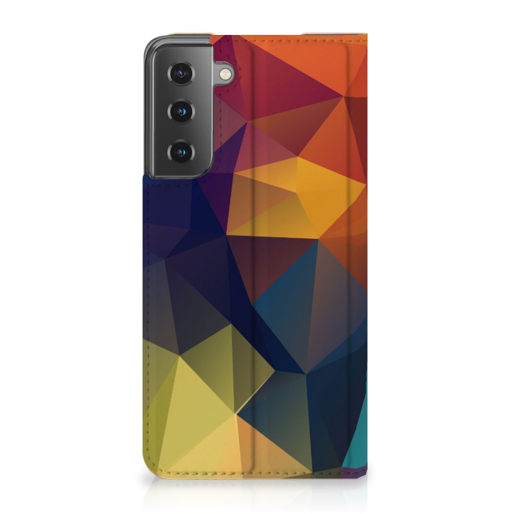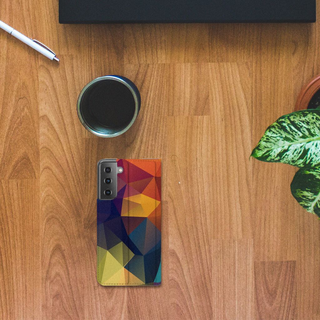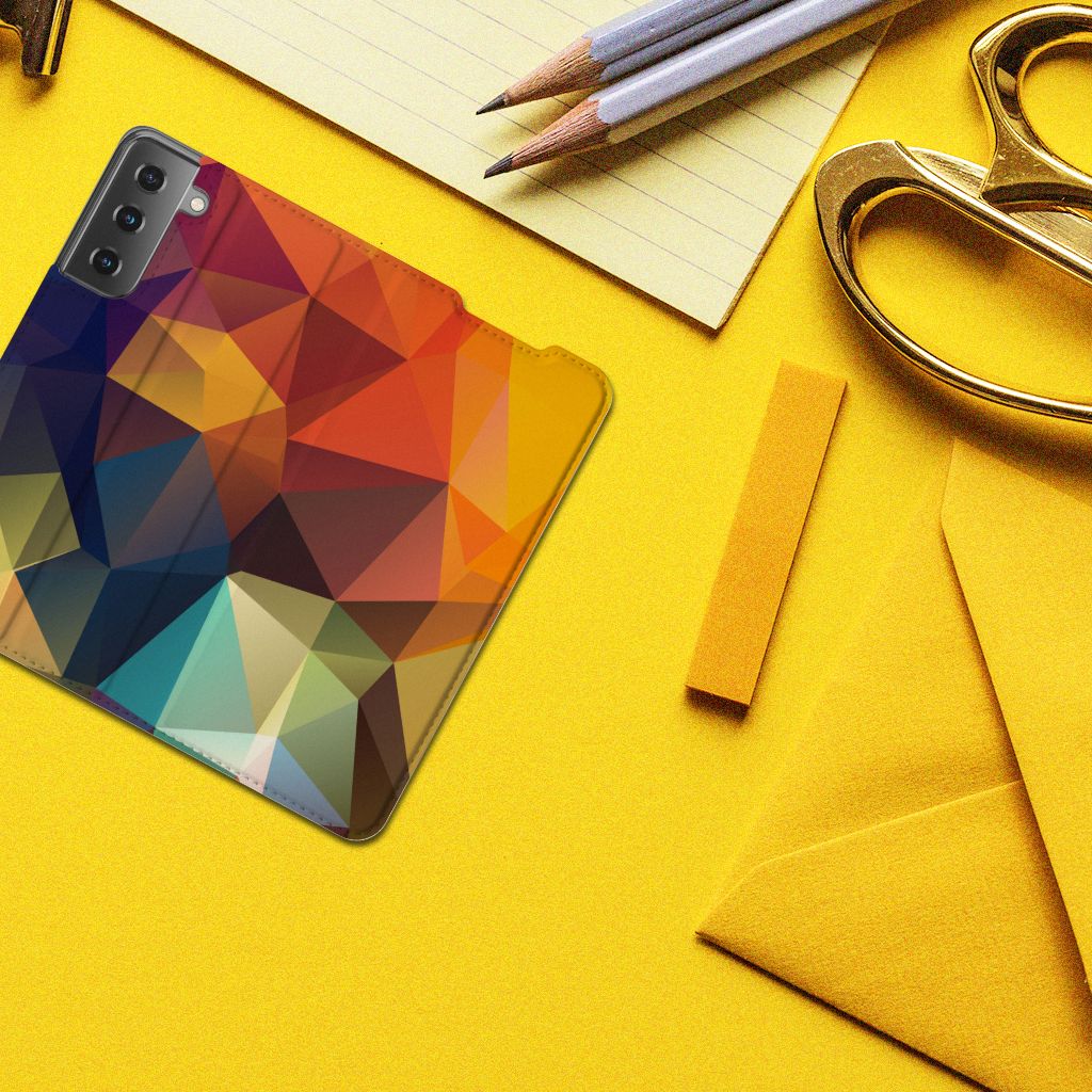 Veelkleurige driehoeken die samen eindeloze asymmetrische patronen lijken te vormen. Het is het abstracte schouwspel dat op dit fraaie hoesje voor je Samsung Galaxy S21 direct de aandacht trekt noemen we voor het gemak trekt noemen we voor het gemak Polygon Color. De een ziet er een berglandschap in, de ander piramides. Wat zie jij erin? Zeker is in elk geval dat de aanblik van dit fascinerende ontwerp je niet snel gaat vervelen. Het kleurige spel van lijnen en vlakken blijft eindeloos boeien en geeft jouw Stand Case een hippe en kunstzinnige uitstraling. De kracht die het lijnenspel uitstraalt, komt ook terug in het hoesje zelf. De solide hoes van PU-leer beschikt ook over een 1 pashouder en een speciale standaard. Het hoesje wordt afgesloten met een magneet aan de binnenzijde. De houder aan de binnenzijde is van TPU. Alle zijden worden bedrukt.