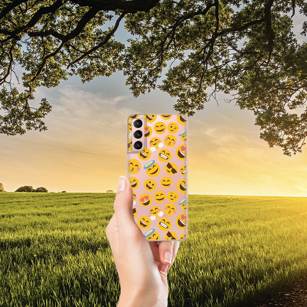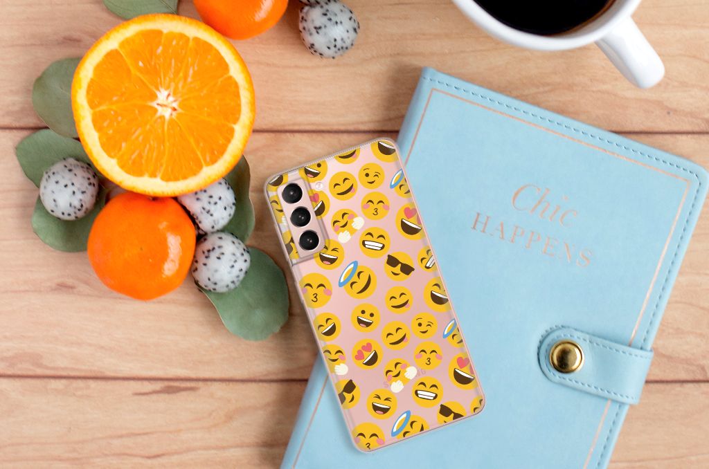 Je gebruikt ze waarschijnlijk dagelijks: emoji’s. Daarom hebben we besloten ze op een design hoesje te zetten. De kleurrijke, vaak gele emoticons maken chatberichten net wat spontaner. Dat hebben we allemaal te danken aan Japan, waar de emoji’s die we zo goed kennen vandaan komen. Ondertussen zijn er meer dan 1800! Deze passen natuurlijk niet allemaal op een Samsung Galaxy S21 TPU bumper, maar we hebben de meeste gebruikte exemplaren erop gezet. Deze tpu case is voorzien van opstaande randen zodat het touchscreen van je telefoon beter is beschermd. Super handig. Het TPU zelf is zeer flexibel en is op maat gemaakt. We gebruiken emoji’s vaak om complete woorden te vervangen. Dit smartphone hoesje zegt dan ook meer dan duizend woorden kunnen. De tpu case wordt alleen aan de bovenzijde bedrukt met emoji’s. De zijkanten van de case worden niet bedrukt en blijven transparant.