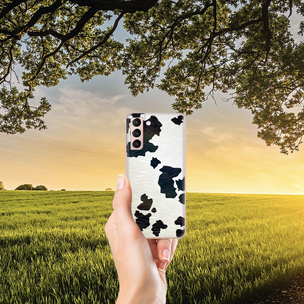De vlekken op de huid van een koe hebben een camouflage functie. Met deze Samsung Galaxy S21 TPU Hoesje met Koeienvlekken hoef je je geen zorgen te maken dat je smartphone schade oploopt. De koeienvlekken zetten we op een tpu case op het moment dat jij je bestelling plaatst. Hierdoor krijgt jouw telefoon een print van koeienvlekken van zeer hoge kwaliteit. Ook omdat we het bedrukken van deze case geheel zelf doen. Jouw telefoon is vooral aan de achterkant en zijkanten goed beschermd. De print van koeienvlekken komt op de bovenkant van het hoesje te staan, de randen blijven doorzichtig. Roofdieren zijn niet geïnteresseerd in koeien dankzij de vlekken op hun huid. Deze beschermende werking heeft ook jouw hoesje met koeienprint.
