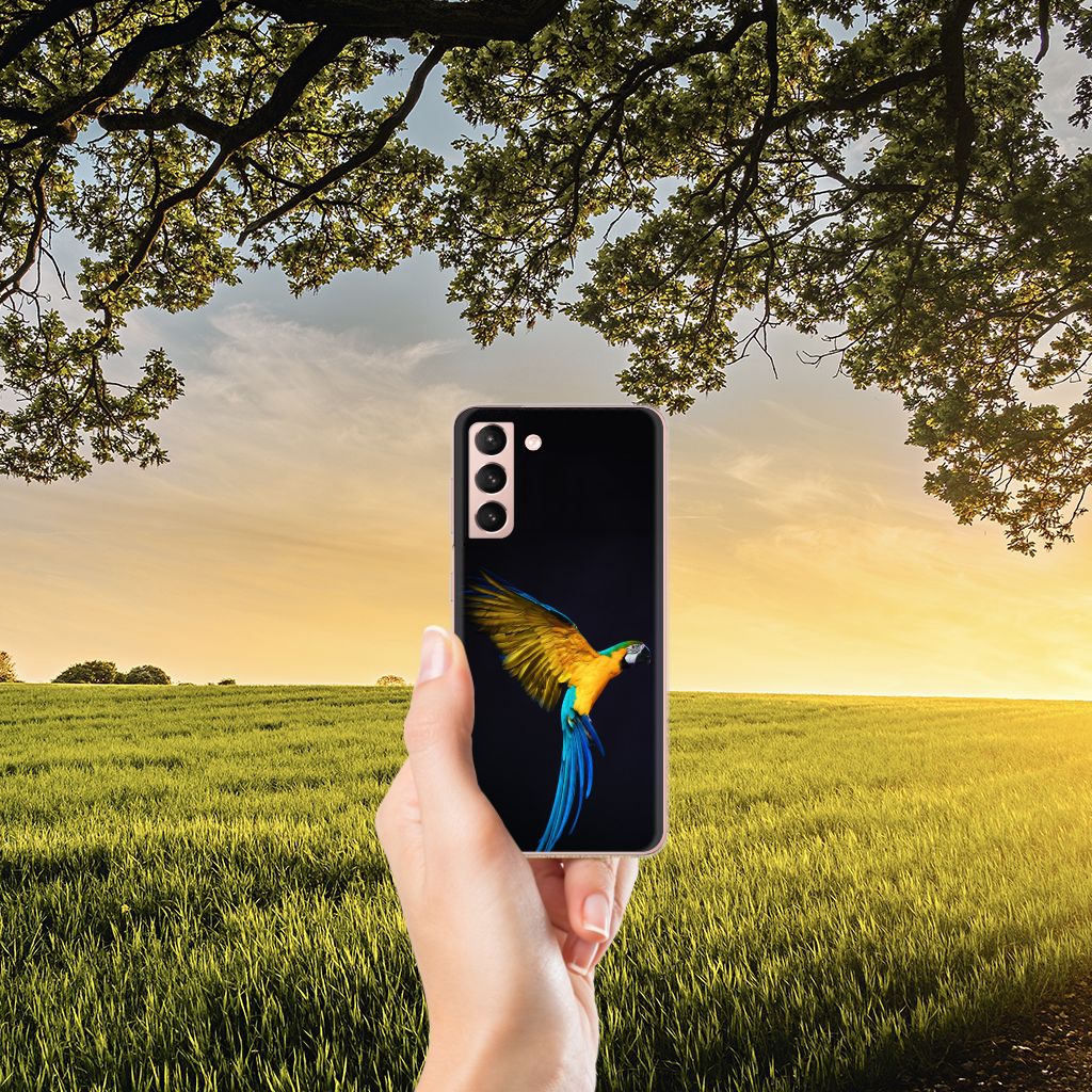 Dit design hoesje met Papegaai tegen een zwarte achtergrond is een zeer flexibele bescherming voor jouw smartphone. Dit komt vooral omdat deze print op een tpu case staat. Dit is een zeer buigzaam hoesje, dat de telefoon vooral aan de achterkant en zijkanten beschermt. De bovenkant van de Samsung Galaxy S21 TPU Hoesje wordt bedrukt met deze schitterende print. De zijkanten blijven doorzichtig. Papegaaien zijn erg sociale vogels die voldoende aandacht en gezelschap nodig hebben. Als je er voor kiest om een papegaai aan te schaffen, is het een goed idee om een koppeltje te nemen. Koop je meerdere tpu cases met een papegaai, dan ga je automatisch minder betalen per hoesje. Wij hanteren een systeem van bundelkorting. Dus koop dit hoesje met opstaande randen voor een spotprijs.