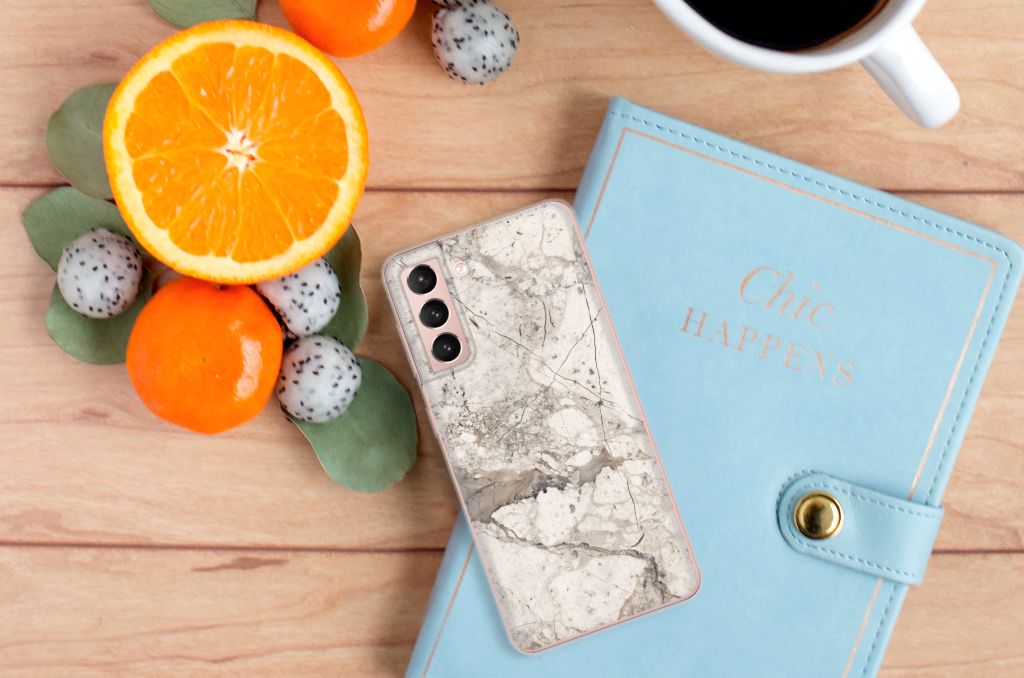 Dit design hoesje met Marmer Beige is voor de artistieke personen onder ons. De Grieken en Romeinen wisten het steen al te waarderen door het als bouw- en bekledingsmateriaal toe te passen. Naast het witte Carrara marmer met haar zacht grijze geaderde belijning zijn de diverse marmersoorten in een ruim kleurenpallet te krijgen. We hebben verschillende kleuren op design hoesjes gezet, zoals in dit geval beige marmer. Dit is een Samsung Galaxy S21 TPU Siliconen Hoesje met marmer in beige kleur. Het marmer wordt bedrukt op de voorkant van een tpu case, die beschikt over opstaande randen aan de voorkant en goed combineert met een screenprotector. De rijkheid aan kleuren en varianties in afwerking geeft designers de vrijheid om met marmer hele mooie architectonische projecten te realiseren. Wij hebben onze designer ook veel vrijheid gegeven. Het resultaat zie je terug in deze tpu case met beige marmer, die jouw smartphone goed beschermt. De zijkanten van de case worden niet bedrukt met marmer.