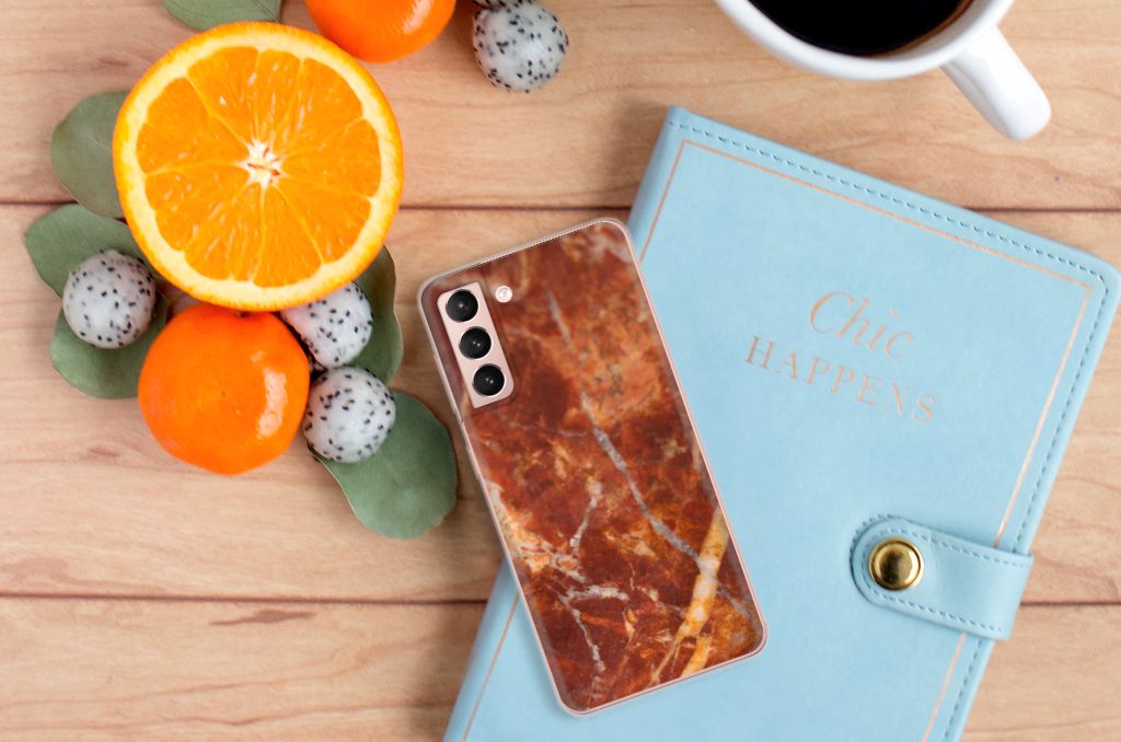 Dit design hoesje met Marmer Bruin is voor de artistieke personen onder ons. De Grieken en Romeinen wisten het al te waarderen door het als bouw- en bekledingsmateriaal toe te passen. Naast het witte Carrara marmer met haar zacht grijze geaderde belijning zijn de diverse soorten in een ruim kleurenpallet te krijgen. We hebben verschillende kleuren op design hoesjes gezet, zoals in dit geval bruin marmer. Dit is een Samsung Galaxy S21 TPU Siliconen Hoesje met marmer in bruine kleur. Het marmer wordt bedrukt op de voorkant van een tpu case, die beschikt over opstaande randen aan de voorkant en heel goed combineert met een screenprotector. De rijkheid aan kleuren en varianties in afwerking geeft ontwerpers de vrijheid om met marmer hele mooie architectonische projecten te realiseren. Wij hebben onze designer ook veel vrijheid gegeven. Het resultaat zie je terug in deze tpu case met bruin marmer, die jouw smartphone goed beschermt. De zijkanten van de case worden niet bedrukt met marmer.