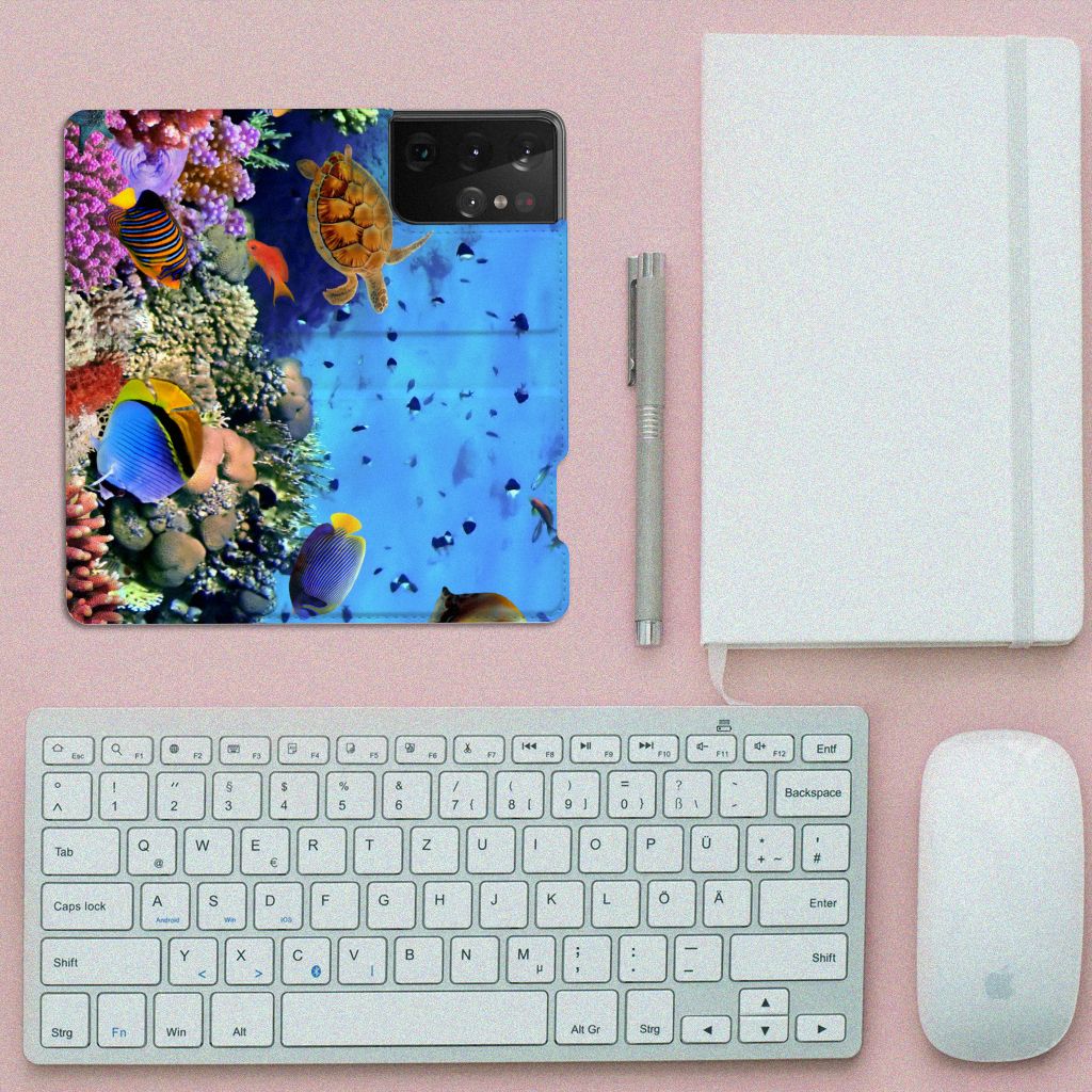 Dit kleurrijke hoesje met tropische Vissen is een ware eyecatcher. Als je aan het duiken bent en je treft een school aan met dit soort opvallende vissen, dan heb je een geweldige ervaring. Maar je hoeft er eigenlijk niet per se het water voor in te duiken. Want wij hebben een schitterende verzameling vissen op dit design hoesje gezet. Met onze zeer geavanceerde printer zetten we de afbeelding van vissen op alle zijden van de Samsung Galaxy S21 Ultra Hoesje maken. De case heeft aan de binnenkant een vakje waarin je jouw creditcard of ander pasje kwijt kunt. Ga je een dagje vissen, dan hoef je de portemonnee dus ook niet op zak te hebben. Verder is je telefoon natuurlijk maximaal beschermd met deze stand case met print van tropische vissen. De houder aan de binnenzijde van het design hoesje met vissen print is van TPU.