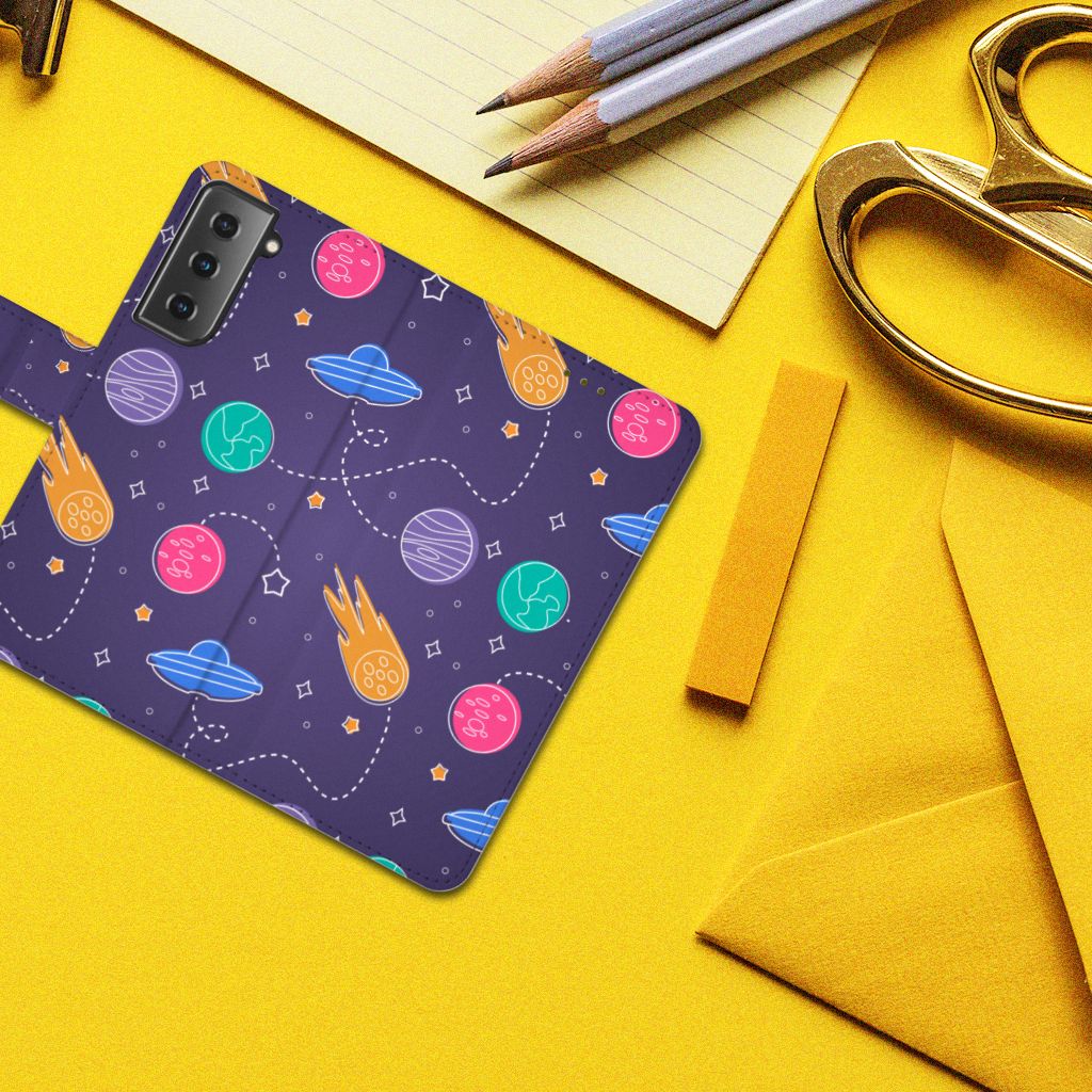 Ben je een beetje geïnteresseerd in buitenaards leven? Dan kan je wel eens enthousiast raken van dit Samsung Galaxy S21 Wallet Case met Pasjes met Space print. Dus mensen die van science fiction houden zullen deze case ongetwijfeld mooi vinden. Er zijn verschillende planeten en vliegende schotels te ontdekken in dit design hoesje. Dit kunstwerkje is voor heel weinig geld te bestellen op onze website. Je krijgt er maximale bescherming van je smartphone voor terug. Het boekhoesje beschermt jouw telefoon aan alle zijden en beschikt over verschillende opbergvakjes voor pasjes en briefgeld. De case sluit perfect af met het lipje aan de buitenkant. Voor een deel komen de vliegende schotels ook terug op het magnetische lipje. De houder aan de binnenzijde is van TPU. Je zult ontdekken dat dit hele stevige telefoonhoesje een heel goede bescherming biedt tegen alle vormen van schade. Met dit hoesje hoef je niet bang te zijn dat er krassen op je design komen of scheuren in je scherm.