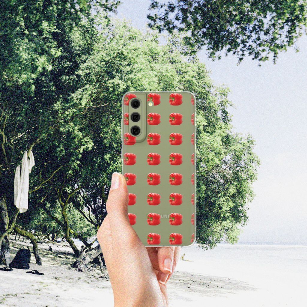 Er zit pit in jouw Samsung Galaxy S21FE Siliconen Case dankzij dit design met rode paprika’s. Paprika’s zijn er in allerlei kleuren en vormen en ze hebben gemeen dat ze heel erg gezond zijn. De rode paprika’s op deze case staan op een grijs met witte geblokte achtergrond en vormen een opvallende verschijning. Heb jij ooit iemand in je nabije omgeving rond zien lopen met een design hoesje met rode paprika’s? Waarschijnlijk niet. Dit hoesje wordt alleen aan de bovenkant bedrukt met paprika’s en is zeer flexibel. De randen van het hoesje blijven transparant en worden niet bedrukt. Met dit hoesje past jouw telefoon altijd in je broekzak. Zeker weten dat je met dit hoesje met rode paprika’s een smartphone accessoire te pakken hebt waarmee je jezelf in de schijnwerpers zet. Als je andere kleuren paprika’s op je hoesje wilt, raden we je aan ons assortiment design hoesjes te bekijken of zelf een hoesje te ontwerpen.
