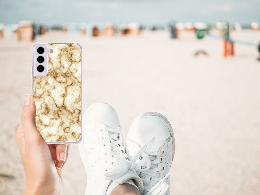 Ben je op zoek naar een uniek telefoonhoesje voor je Samsung Galaxy S22? Dan ben je bij B2C Telecom aan het juiste adres! Speciaal voor jou hebben we dit prachtige Marmer Goud design in onze collectie hoesjes opgenomen. Het design wordt bedrukt op een Anti-Shock Hoesje en is gemaakt van flexibel rubber. Het hoesje is perfect voor de actieve smartphonegebruiker door de opstaande randen/hoeken. Denk aan mensen die veel sporten, reizen of wandelen en net iets meer zekerheid willen als het op hun geliefde telefoon aankomt. Het design wordt alleen aan de bovenkant van het hoesje bedrukt en de randen blijven transparant. Aan de zijkanten zijn uitsparingen gemaakt waardoor je met gemak alle knoppen en poorten kunt bedienen. Wij adviseren om dit hoesje in combinatie met een screenprotector te gebruiken voor een langere levensduur van je telefoon. Wil je dit hoesje nog iets extra's geven? Voeg dan gratis je naam of een quote toe! Is dit design hoesje toch niet helemaal wat je zocht? Ontwerp dan zelf een hoesje in ons ontwerpprogramma.