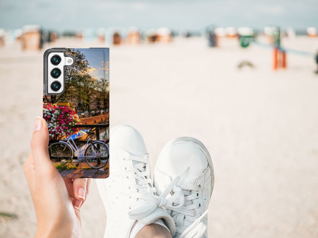 Amsterdam is meer dan ooit een toeristische trekpleister. Een bezoek aan de hoofdstad is niet compleet als er geen bezoek is gebracht aan de Amsterdamse Grachten. Ze zijn een symbool van de stad en hebben een enorme culturele en historische waarde. Daarom kunnen ze natuurlijk niet ontbreken in onze collectie design hoesjes. Dit schitterende design hoesje met Amsterdamse grachten tref je enkel en alleen aan bij B2C Telecom. De ondergaande zon en de fleurige en fraaie bloempakketten zorgen voor een prachtig totaalplaatje. Amsterdam is wereldberoemd om haar prachtige grachten uit de zeventiende eeuw. Dit smartphone hoesje is hier een eerbetoon aan. Het design staat op een stand case. Deze Samsung Galaxy S22 Book Cover beschermt jouw telefoon aan alle kanten en beschikt over een 1 opbergvakje en een speciale standaard. Het hoesje wordt afgesloten met een magneet aan de binnenzijde. De houder aan de binnenzijde is van TPU. Alle zijden van de stand case worden bedrukt.