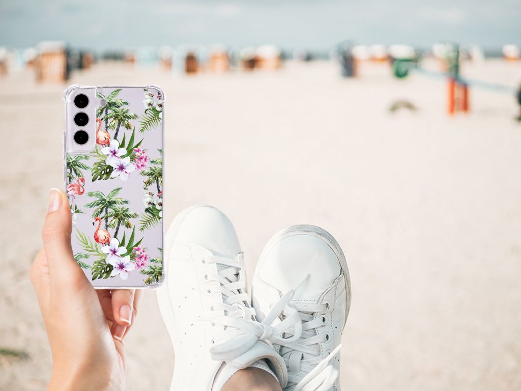 Ben je op zoek naar een uniek telefoonhoesje voor je Samsung Galaxy S22? Dan ben je bij B2C Telecom aan het juiste adres! Speciaal voor jou hebben we dit prachtige Flamingo Palms design in onze collectie hoesjes opgenomen. Het design wordt bedrukt op een Case Anti-shock en is gemaakt van flexibel rubber. Het hoesje is perfect voor de actieve smartphonegebruiker door de opstaande randen/hoeken. Denk aan mensen die veel sporten, reizen of wandelen en net iets meer zekerheid willen als het op hun geliefde telefoon aankomt. Het design wordt alleen aan de bovenkant van het hoesje bedrukt en de randen blijven transparant. Aan de zijkanten zijn uitsparingen gemaakt waardoor je met gemak alle knoppen en poorten kunt bedienen. Wij adviseren om dit hoesje in combinatie met een screenprotector te gebruiken voor een langere levensduur van je telefoon. Wil je dit hoesje nog iets extra's geven? Voeg dan gratis je naam of een quote toe! Is dit design hoesje toch niet helemaal wat je zocht? Ontwerp dan zelf een hoesje in ons ontwerpprogramma.