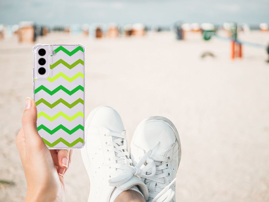 Ben je op zoek naar een uniek telefoonhoesje voor je Samsung Galaxy S22? Dan ben je bij B2C Telecom aan het juiste adres! Speciaal voor jou hebben we dit prachtige Zigzag Groen design in onze collectie hoesjes opgenomen. Het design wordt bedrukt op een Doorzichtige Silicone Hoesje en is gemaakt van flexibel rubber. Het hoesje is perfect voor de actieve smartphonegebruiker door de opstaande randen/hoeken. Denk aan mensen die veel sporten, reizen of wandelen en net iets meer zekerheid willen als het op hun geliefde telefoon aankomt. Het design wordt alleen aan de bovenkant van het hoesje bedrukt en de randen blijven transparant. Aan de zijkanten zijn uitsparingen gemaakt waardoor je met gemak alle knoppen en poorten kunt bedienen. Wij adviseren om dit hoesje in combinatie met een screenprotector te gebruiken voor een langere levensduur van je telefoon. Wil je dit hoesje nog iets extra's geven? Voeg dan gratis je naam of een quote toe! Is dit design hoesje toch niet helemaal wat je zocht? Ontwerp dan zelf een hoesje in ons ontwerpprogramma.