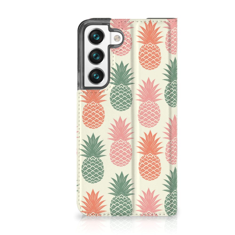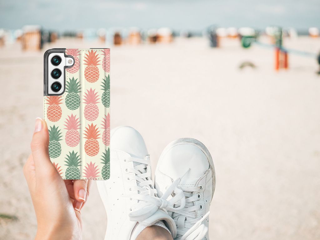 Ananas is een woord uit het Tupi, de taal van de Tupi-indianen, en betekent uitmuntende vrucht. Dit fruit van zeer hoge kwaliteit staat op onze superieure boekhoesjes, stand cases, hard cases en TPU cases. Jij blijft er gezond uitzien als je zo nu en dan een hap neemt van een Ananas , jouw smartphone blijft tip top in orde als je er een leuk telefoonhoesje omheen doet. Een ananas heeft stevig, veerkrachtig vruchtvlees. Een beetje te vergelijken met het TPU in onze hoesjes. TPU is elastisch materiaal, dat zeer buigzaam is. Vandaar dat het zeer schokbestendig is. Het ananas design staat op een stand case. Deze Samsung Galaxy S22 Flip Style Cover beschermt jouw telefoon aan alle kanten en beschikt over een 1 opbergvakje en een speciale standaard. Het hoesje wordt afgesloten met een magneet aan de binnenzijde. De houder aan de binnenzijde is van TPU.