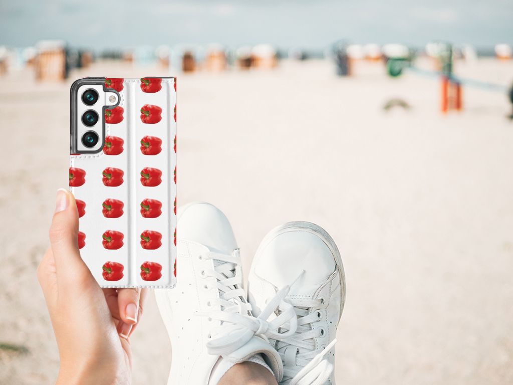 Er zit pit in jouw Samsung Galaxy S22 Flip Style Cover dankzij dit design met rode paprika’s. Paprika’s zijn er in allerlei kleuren en vormen en ze hebben gemeen dat ze heel erg gezond zijn. De rode paprika’s op deze case staan op een grijs met witte geblokte achtergrond en vormen een opvallende verschijning. Heb jij ooit iemand in je nabije omgeving rond zien lopen met een design hoesje met rode paprika’s? Waarschijnlijk niet. Dit stand hoesje met rode paprika’s beschermt jouw telefoon aan alle zijden en beschikt over een opbergvakje voor een pasje of briefgeld. De case sluit perfect af met de magneet aan de binnenzijde. Zeker weten dat je met dit hoesje met rode paprika’s een smartphone accessoire te pakken hebt waarmee je jezelf in de schijnwerpers zet. De houder aan de binnenzijde van de stand case met rode paprika’s is van TPU. Als je andere kleuren paprika’s op je hoesje wilt, raden we je aan ons assortiment design hoesjes te bekijken of zelf een hoesje te ontwerpen.