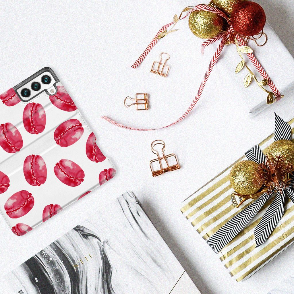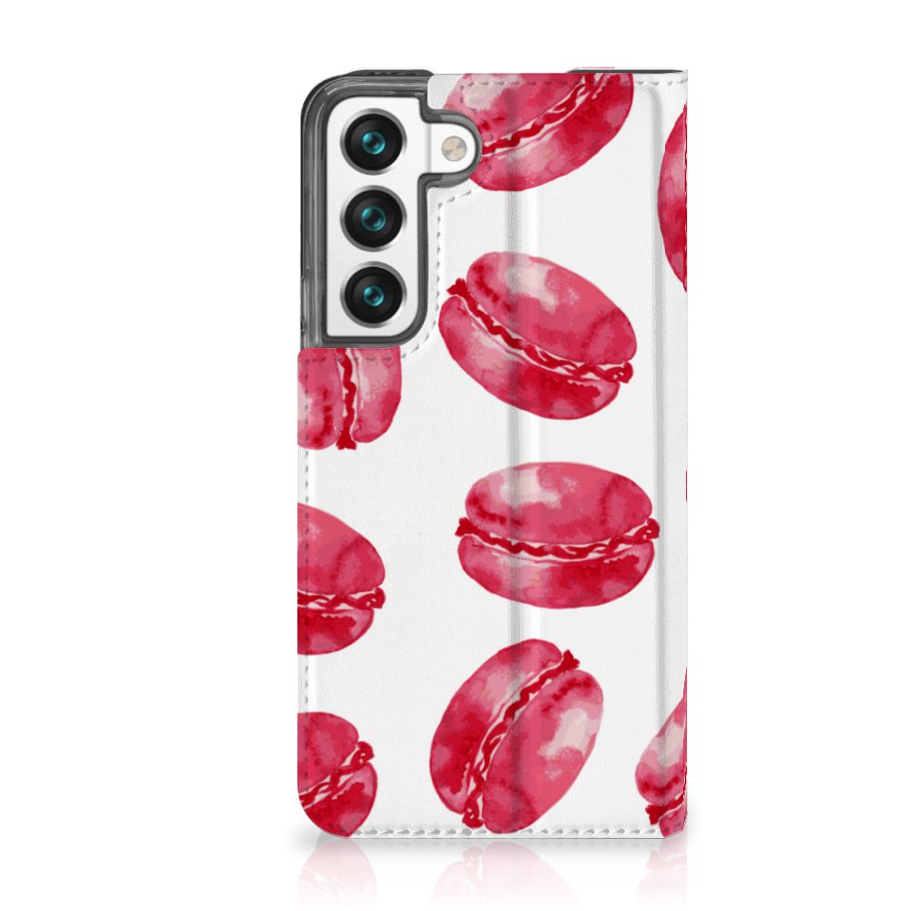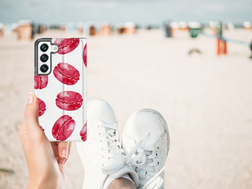 Dit stand hoesje met Pink Macarons is een zeer opvallende bescherming voor jouw smartphone. Macarons zijn Franse koekjes: kleine, rond en luchtig. Ze worden in veel verschillende smaken gemaakt, herkenbaar aan de verschillende kleuren zoals chocolade (donkerbruin), mokka (middenbruin), kersen (rood), pistache (groen), aardbei (roze), framboos (karmijn). Deze kleuren kun je net allemaal zien op dit fraaie design hoesje met roze macarons. Heb je altijd al een Samsung Galaxy S22 Flip Style Cover willen hebben met roze macarons? Grijp dan nu je kans. Deze case heeft zeer veel goede eigenschappen, zoals 1 opbergvakje en een magnetische sluiting aan de binnenkant. Dit design hoesje met roze macarons wordt aan alle zijden bedrukt. De houder aan de binnenkant van het hoesje is van TPU. De case heeft ook een handige standaard.