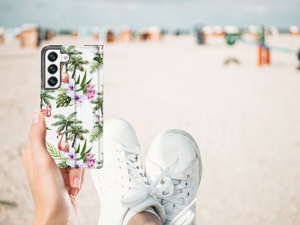Een Samsung Galaxy S22 Hoesje maken met Flamingo Palms is in vele opzichten bijzonder. De rode flamingo op het hoesje kent zijn oorsprong in het Caraïbische gebied. Stel dat je in deze regio vakantie aan het vieren bent, dan val je zonder meer op met dit hoesje met flamingo’s en palmbomen. Dit hoesje biedt bescherming voor alle zijden van je telefoon. Jouw apparaat ligt goed opgeborgen in de TPU houder aan de binnenzijde en de buitenkant van het hoesje met flamingo’s en palmbomen heeft een magnetische sluiting. Ook de palmbomen op deze stand case geven jou natuurlijk een ultiem vakantiegevoel. Het stand hoesje met flamingo’s en palmbomen heeft een vakje voor pasjes en een standaard en is op maat gemaakt.