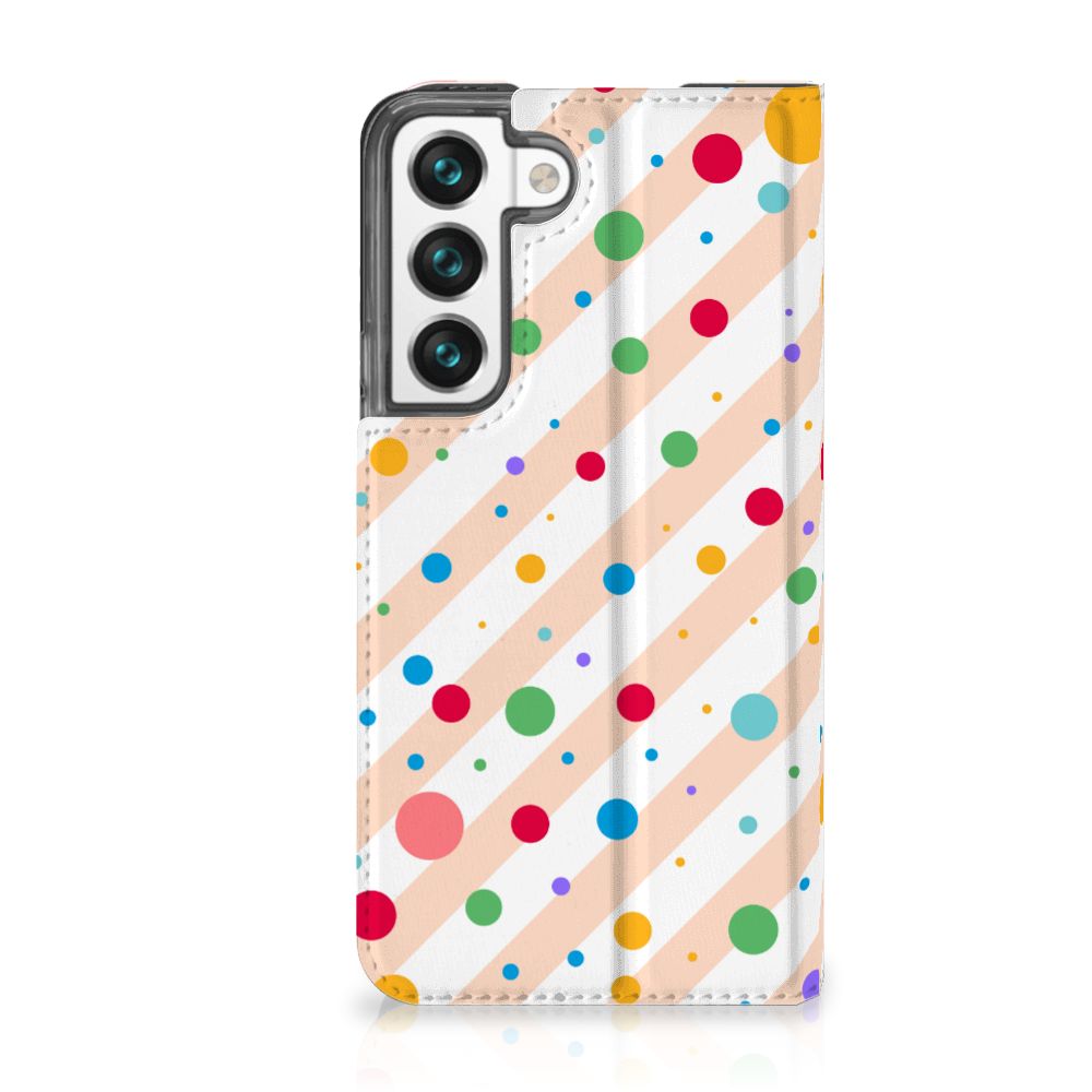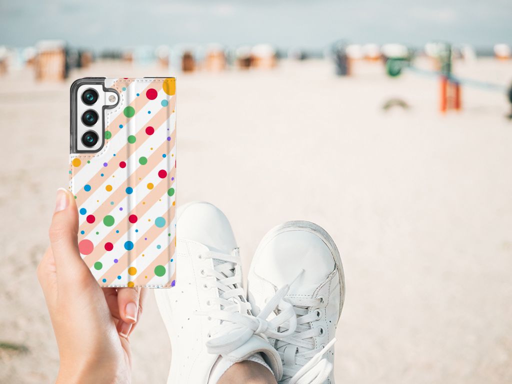 Een Samsung Galaxy S22 Hoesje met Magneet met verschillende kleuren stippen is een schitterende bescherming van jouw smartphone. De stand case met het design Dots in alle kleuren van de regenboog komt voor jou als geroepen. Maak je geen gebruik van dit zeer mooie hoesje, dan kan het met jouw smartphone een beetje beroerd aflopen. Dit mooie stand hoesje met verschillende kleuren stippen zorgt voor een volledige bescherming van je smartphone en wordt aan alle zijden bedrukt. Dankzij de speciale standaard kun je rustig achteroverleunend filmpjes bekijken terwijl je je handen vrij hebt. Verder is de houder aan de binnenzijde van TPU. Jouw telefoon is dus zeer goed opgeborgen en kan geen kant op. Met een hoesje met stippen in verschillende kleuren op alle zijden blijft jouw telefoon volledig in tact. Heb je liever een stand case met stippen in andere opvallende kleuren? Ontwerp dan zelf case met je eigen foto’s en teksten!